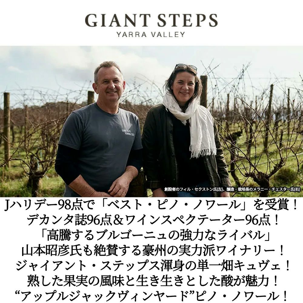 ジャイアント・ステップスについて輸入元さんのコメントは「冷涼なテロワールの個性を表現する、「ブルゴーニュの強力なライバル」ジャイアント・ステップスは、冷涼な気候における単一畑の素晴らしいピノ・ノワール、シャルドネを手掛けるワイナリー。創設者のフィル・セクストン氏は、マーガレット・リヴァーでデヴィルズ・レアーなどを立ち上げており、冷涼な気候の単一畑でピノ・ノワールとシャルドネを造るためビクトリア州のヤラ・ヴァレーに移住。そして、1998年にワイナリーを設立しました。