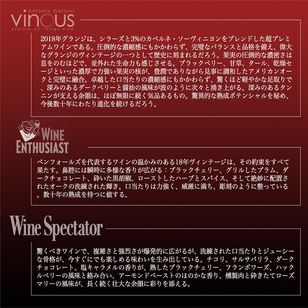 ヴィノス誌98点でコメントは『2018年グランジは、シラーズと3%のカベルネ・ソーヴィニヨンをブレンドした超プレミアムワインである。圧倒的な濃縮感にもかかわらず、完璧なバランスと品格を備え、偉大なグランジのヴィンテージの一つとして歴史に刻まれるだろう。果実の圧倒的な濃密さは息をのむほどで、並外れた生命力も感じさせる。ブラックベリー、甘草、タール、乾燥セージといった濃厚で力強い果実の核が、豊潤でありながら見事に調和したアメリカンオークと完璧に融合。卓越した口当たりの濃縮感にもかかわらず、驚くほど軽やかな足取りで、深みのあるダークベリーと醤油の風味が波のように次々と湧き上がる。深みのあるタンニンが支える余韻は、ほぼ無限に続く気品あるもの。驚異的な熟成ポテンシャルを秘め、今後数十年にわたり進化を続けるだろう。』と大絶賛!