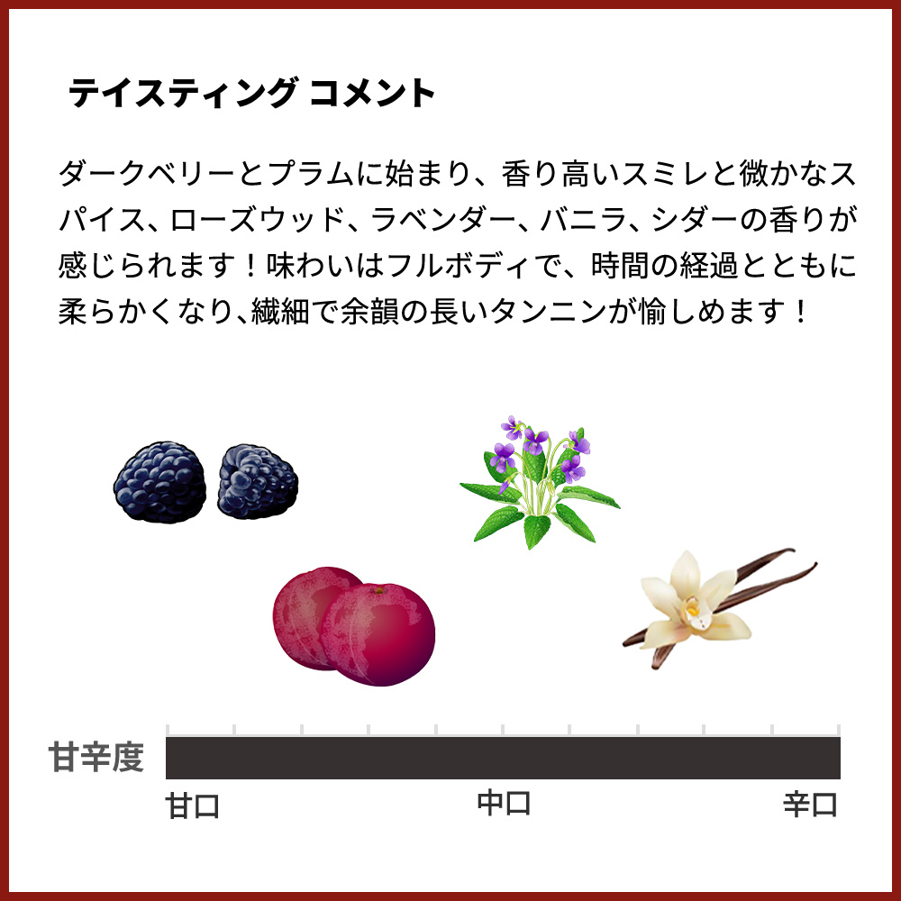 ダークベリーとプラムに始まり、香り高いスミレと微かなスパイス、ローズウッド、ラベンダー、バニラ、シダーの香りが感じられます!味わいはフルボディで、時間の経過とともに柔らかくなり、繊細で余韻の長いタンニンが愉しめます!