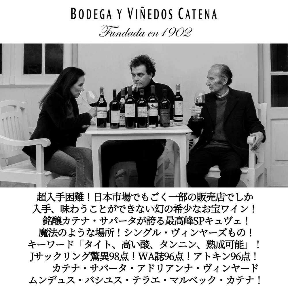 カテナ・サパータ・アドリアンナ・ヴィンヤード・ムンデュス・バシユス・テラエ・マルベック・カテナ[2015]年蔵出し品・フレンチオーク樽100%醗酵&フレンチオーク樽100%で18ヶ月熟成・ボデガス・カテナ・サパータ元詰・ジェームス・サックリング驚異の98点&ワインアドヴォケイト誌驚異の96点&ティム・アトキン96点・年産少量・(全米リリース価格335ドル)・正規品