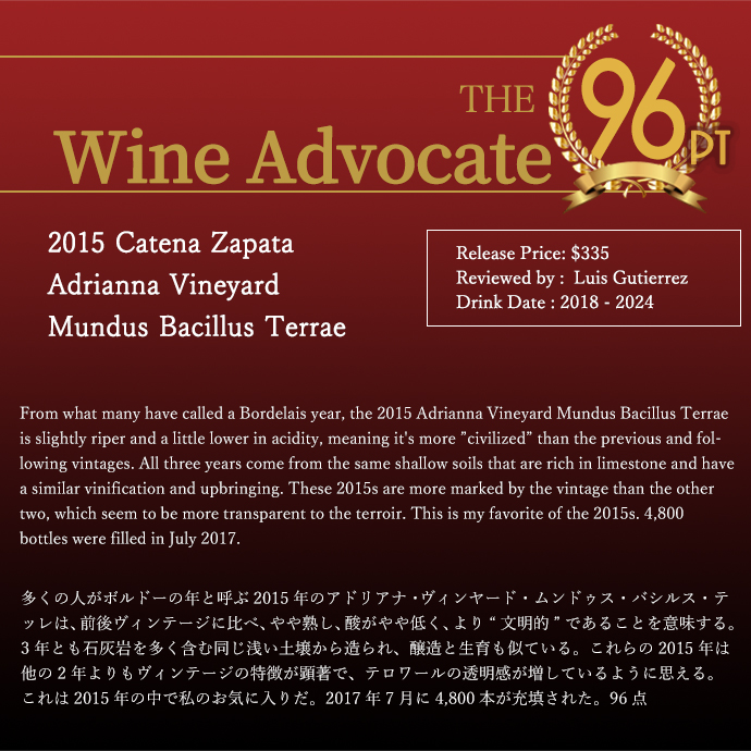 もちろんロバート・パーカー満点★★★★★5つ星生産者で、なんと!この[2015]年のアドリアンナ・ヴィンヤード・ムンデュス バシユス テラエ マルベック カテナ[2015]年で、ワインアドヴォケイト誌驚異の96点獲得!しかも絶賛コメントは『多くの人がボルドーの年と呼ぶ2015年のアドリアナ・ヴィンヤード・ムンドゥス・バシルス・テッレは、前後ヴィンテージに比べ、やや熟し、酸がやや低く、より“文明的”であることを意味する。3年とも石灰岩を多く含む同じ浅い土壌から造られ、醸造と生育も似ている。これらの2015年は他の2年よりもヴィンテージの特徴が顕著で、テロワールの透明感が増しているように思える。これは2015年の中で私のお気に入りだ。2017年7月に4,800本が充填された。96点』と大注目!