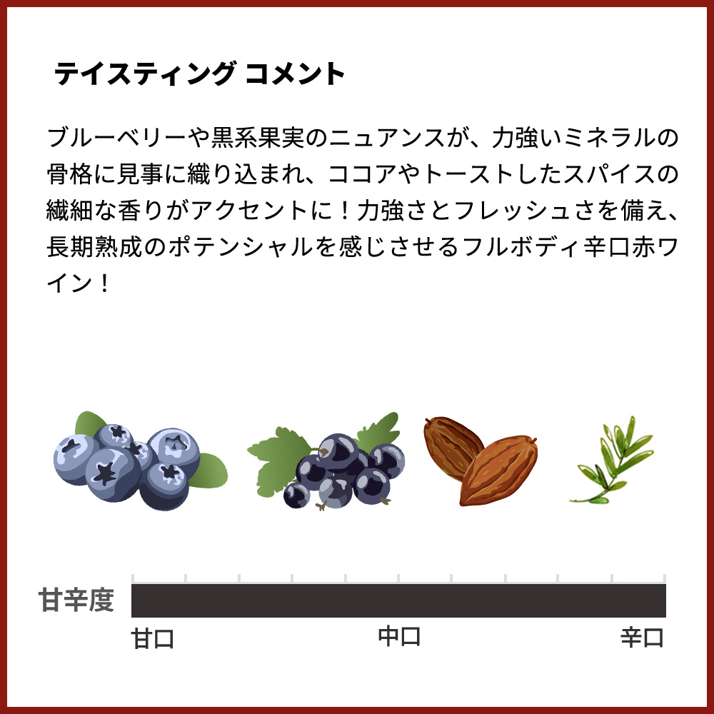 ブルーベリーや黒系果実のニュアンスが、力強いミネラルの骨格に見事に織り込まれ、ココアやトーストしたスパイスの繊細な香りがアクセントに!力強さとフレッシュさを備え、長期熟成のポテンシャルを感じさせるフルボディ辛口赤ワインが飲み頃10年熟成作品で正規品で限定少量入荷!