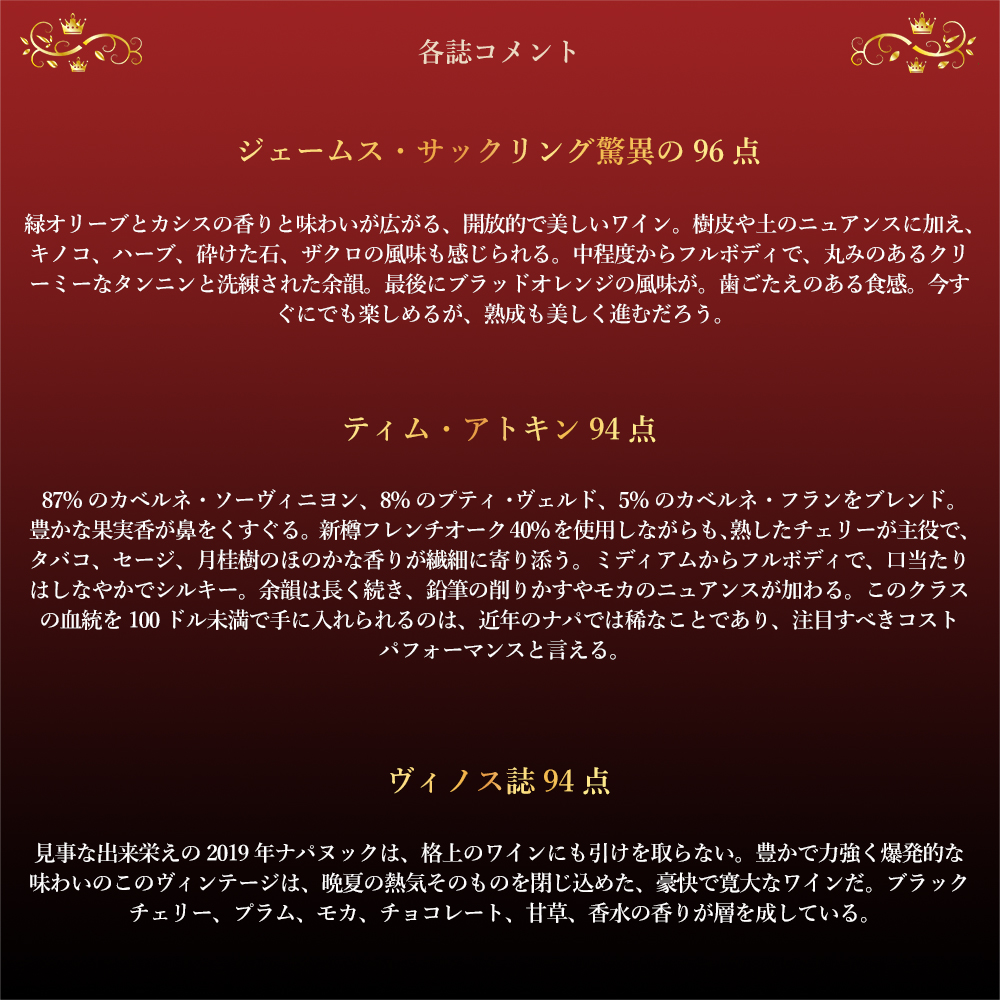 ヴィノス誌94点でコメントは「見事な出来栄えの2019年ナパヌックは、格上のワインにも引けを取らない。豊かで力強く爆発的な味わいのこのヴィンテージは、晩夏の熱気そのものを閉じ込めた、豪快で寛大なワインだ。ブラックチェリー、プラム、モカ、チョコレート、甘草、香水の香りが層を成している。」で高評価!