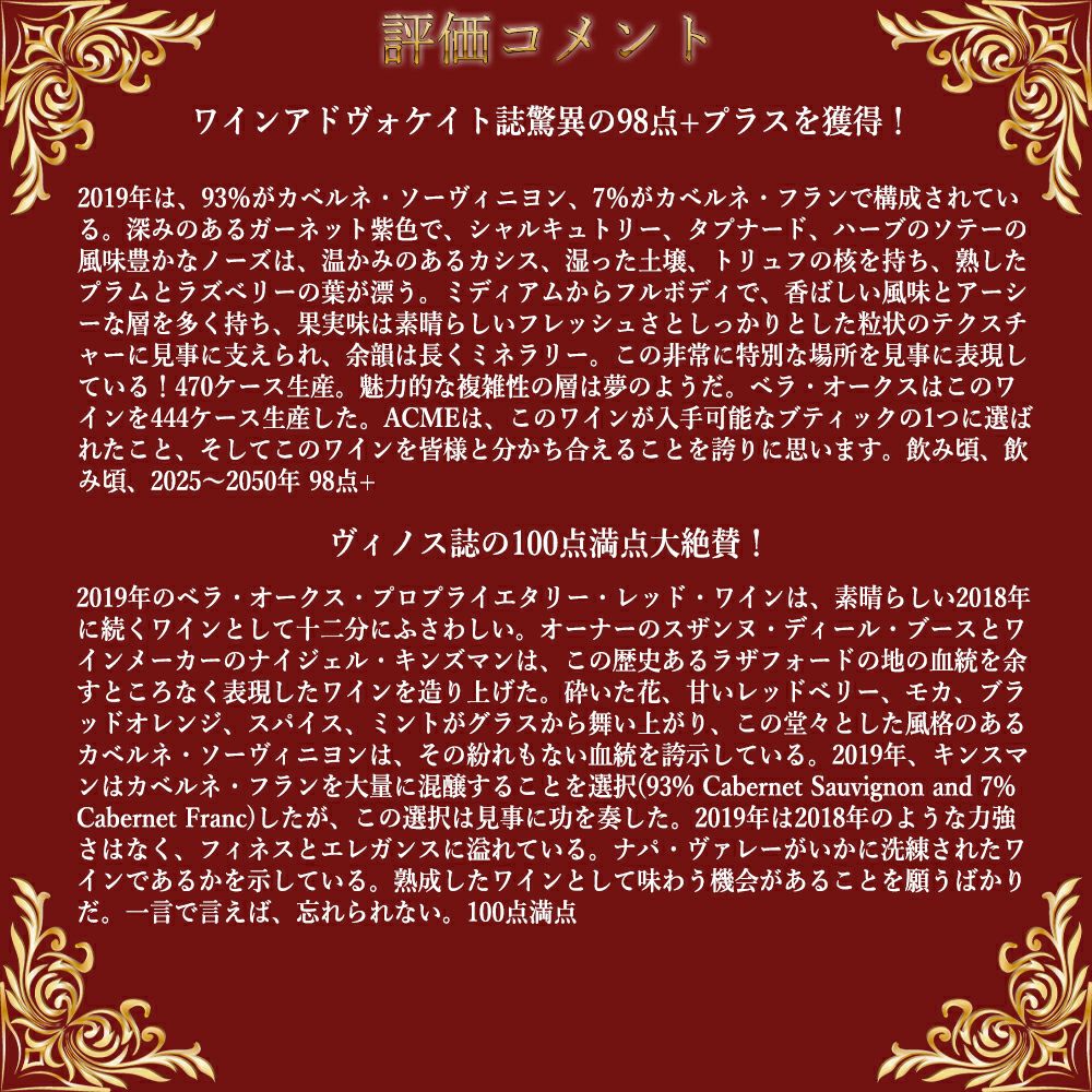 この2019年でワインアドヴォケイト誌驚異の98点+プラスを獲得!絶賛コメントは『2019年は、93%がカベルネ・ソーヴィニヨン、7%がカベルネ・フランで構成されている。深みのあるガーネット紫色で、シャルキュトリー、タプナード、ハーブのソテーの風味豊かなノーズは、温かみのあるカシス、湿った土壌、トリュフの核を持ち、熟したプラムとラズベリーの葉が漂う。ミディアムからフルボディで、香ばしい風味とアーシーな層を多く持ち、果実味は素晴らしいフレッシュさとしっかりとした粒状のテクスチャーに見事に支えられ、余韻は長くミネラリー。この非常に特別な場所を見事に表現している!470ケース生産。魅力的な複雑性の層は夢のようだ。ベラ・オークスはこのワインを444ケース生産した。ACMEは、このワインが入手可能なブティックの1つに選ばれたこと、そしてこのワインを皆様と分かち合えることを誇りに思います。飲み頃、飲み頃、2025~2050年 98点+』と大絶賛!