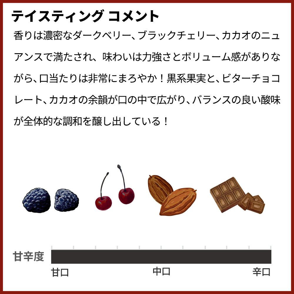 深紅に近い濃い色合い!香りは濃密なダークベリー、ブラックチェリー、カカオのニュアンスで満たされ、味わいは力強さとボリューム感がありながら、口当たりは非常にまろやか!良く熟した葡萄が使われていることが感じ取られ、若いワインとしてはかなり滑らかでしなやかな質の良いタンニンが見事に表現されている!黒系果実と、ビターチョコレート、カカオの余韻が口の中で広がり、バランスの良い酸味が全体的な調和を醸し出している!
