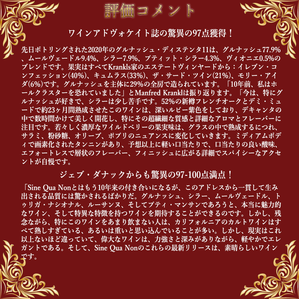 ジェブ・ダナックからも驚異の97-100点満点の高評価のコメントは『「Sine Qua Nonとはもう10年来の付き合いになるが、このアドレスから一貫して生み出される品質には驚かされるばかりだ。グルナッシュ、シラー、ムールヴェードル、トゥリガ・ナシオナル、ルーサンヌ、そしてプティ・マンサンであろうと、本当に魅力的なワイン、そして特異な特徴を持つワインを期待することができるのです。しかし、残念ながら、特にこのワインをあまり飲まない人は、カリフォルニアのカルトワインはすべて熟しすぎている、あるいは重いと思い込んでいることが多い。しかし、現実はこれ以上ないほど違っていて、偉大なワインは、力強さと深みがありながら、軽やかでエレガントである。そして、Sine Qua Nonのこれらの最新リリースは、素晴らしいワインです。』