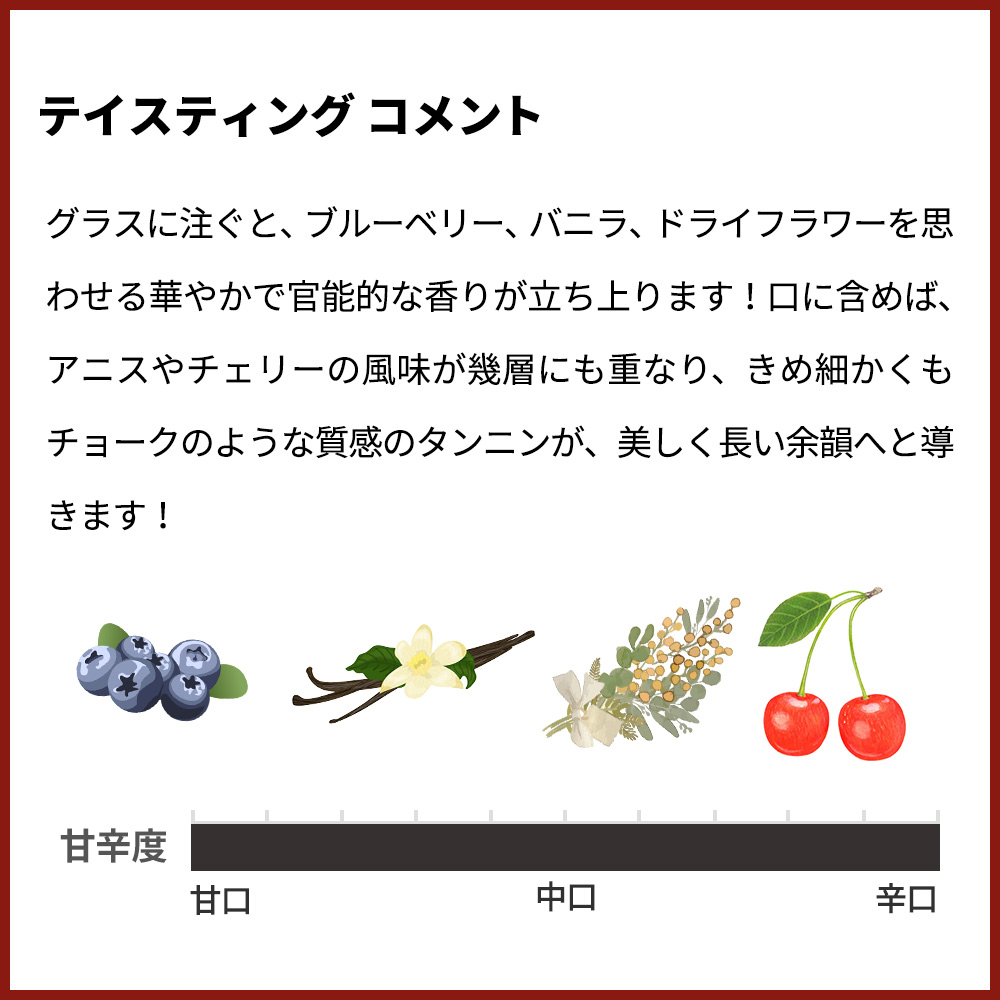 「香りはブラックチェリー、ブルーベリー、カシスなどの黒系果実に、バニラやモカ、杉、スパイスのニュアンスが重なり、グラスを回すほどに複雑さが広がります。口に含むと、凝縮した果実味が滑らかに広がり、しなやかなタンニンと心地よい酸が見事なバランスを保ちます。ミッドパレットにはプラムやチョコレート、アニス、乾いた花のようなニュアンスが感じられ、奥行きと品格を演出します。樽由来のトースト香とミネラル感が余韻を引き締め、長く持続するフィニッシュへとつながります。若いうちは力強く濃密な印象ですが、熟成によって果実味と樽香が調和し、よりシルキーで複雑な表情を見せるポテンシャルがあります。全体として、ナパ・カベルネの厚みとボルドー的な緻密さを融合させた、タイムレス(時を超える)名にふさわしい洗練された味わいのワイン」!