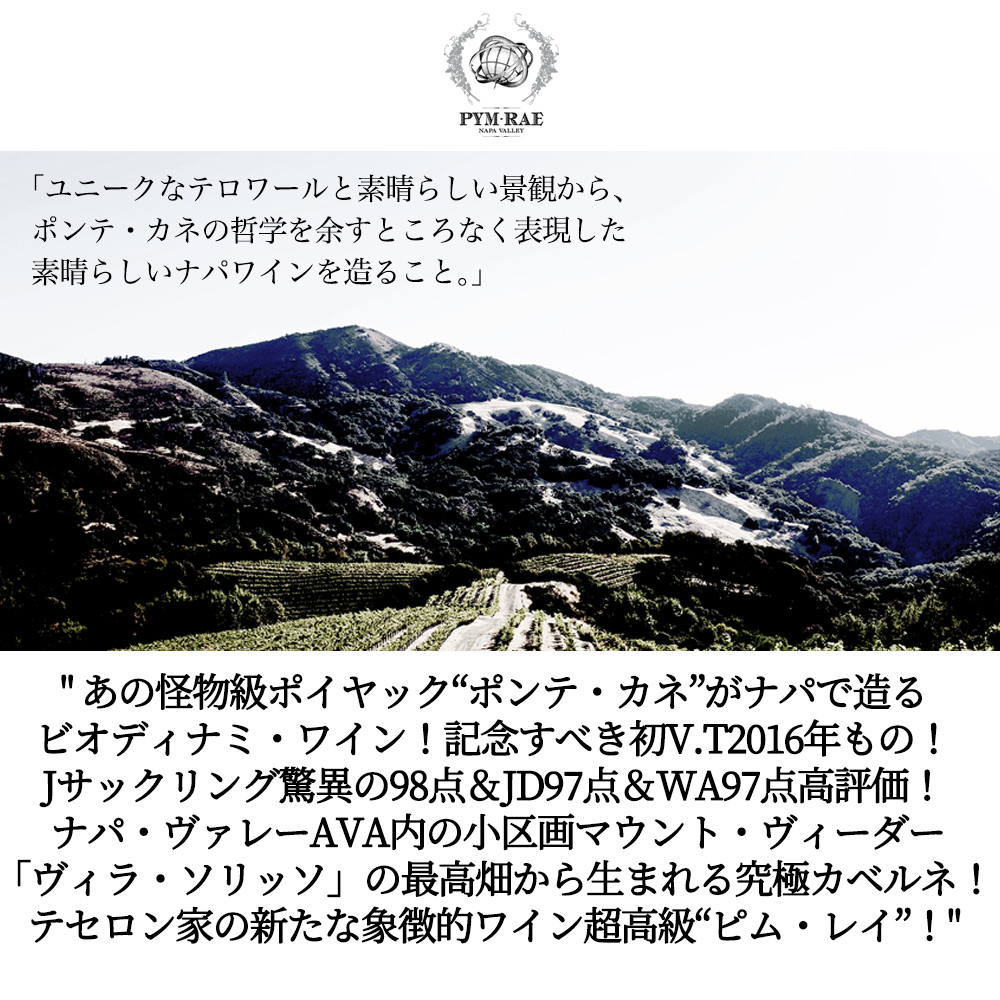 超高級カリフォルニア愛好家垂涎!ナパ・カベルネ愛好家垂涎!あの怪物級ポイヤック“ポンテ・カネ”がナパで造るビオディナミ・ワイン“ピム・レイ”!