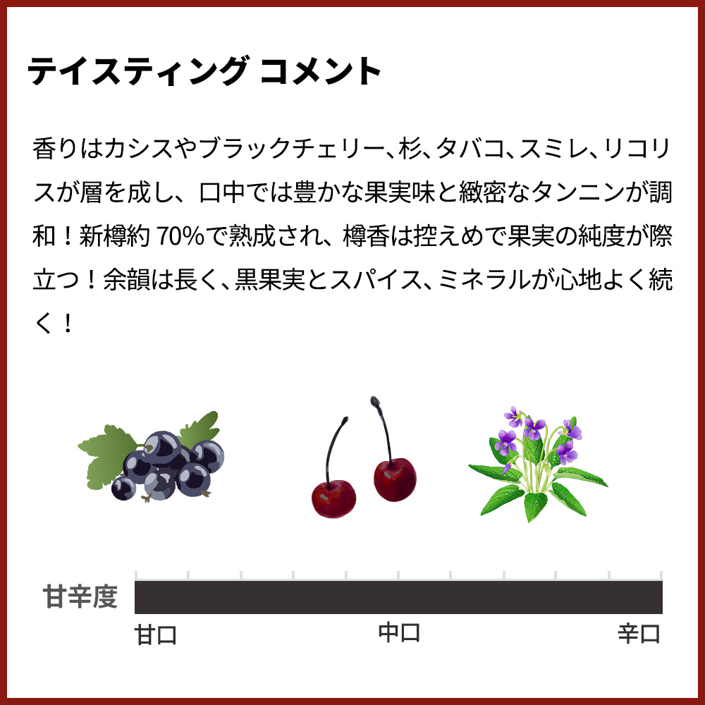 - ブドウ品種カベルネ・ソーヴィニヨン76%、メルロー17%、カベルネ・フラン7%