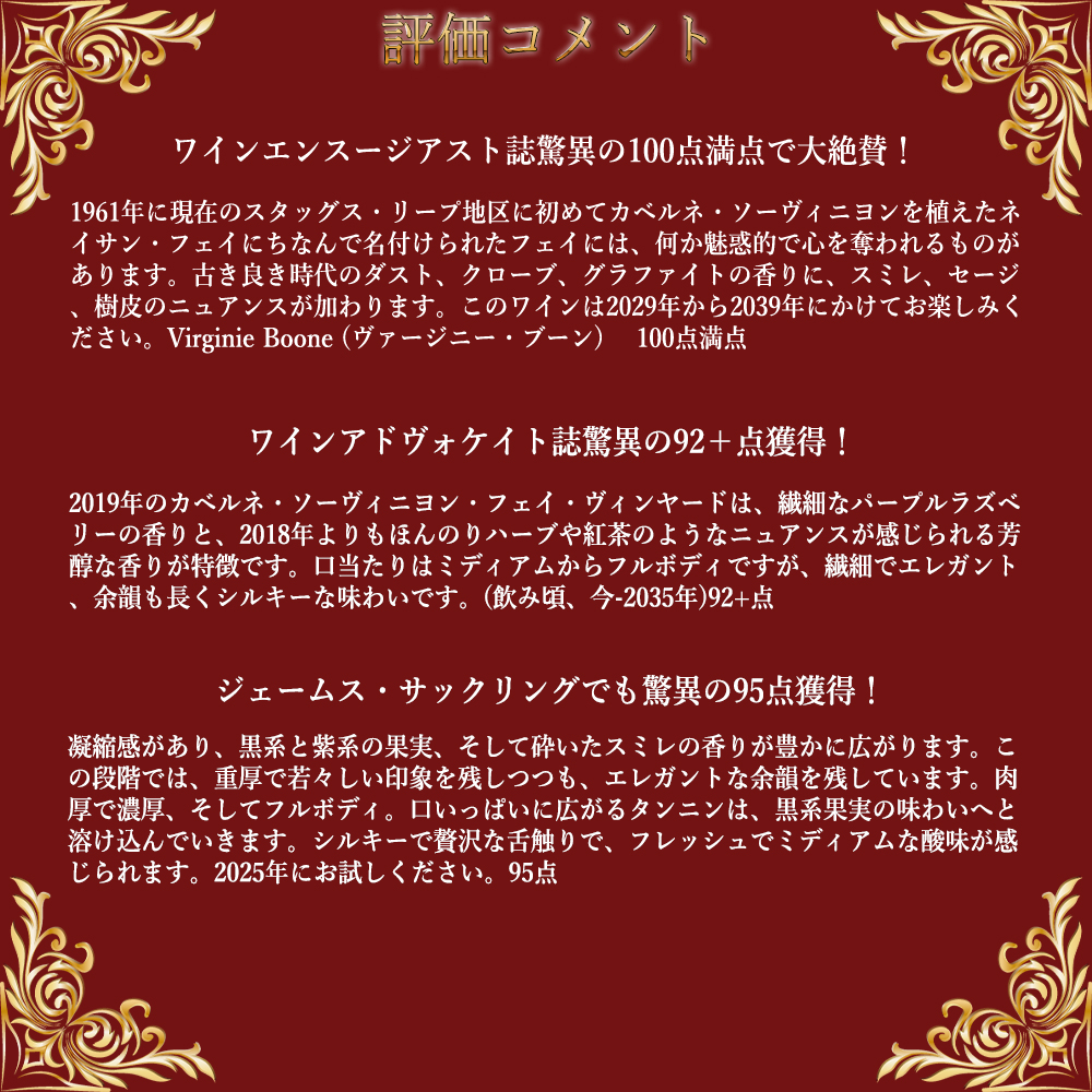 この貴重な7年熟成のこのフェイにワインエンスージアスト誌驚異の100点満点で大絶賛!大絶賛コメントは『1961年に現在のスタッグス・リープ地区に初めてカベルネ・ソーヴィニヨンを植えたネイサン・フェイにちなんで名付けられたフェイには、何か魅惑的で心を奪われるものがあります。古き良き時代のダスト、クローブ、グラファイトの香りに、スミレ、セージ、樹皮のニュアンスが加わります。このワインは2029年から2039年にかけてお楽しみください。Virginie Boone (ヴァージニー・ブーン) 100点満点』と大絶賛!