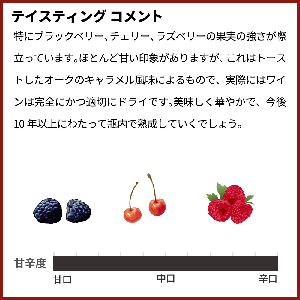 ワインエンスージアスト誌驚異の93点で大絶賛!大絶賛コメントは『これは非常に味の濃いカベルネで、特にブラックベリー、チェリー、ラズベリーの果実の強さが際立っています。ほとんど甘い印象がありますが、これはトーストしたオークのキャラメル風味によるもので、実際にはワインは完全にかつ適切にドライです。美味しく華やかで、今後10年以上にわたって瓶内で熟成していくでしょう。93点』と大注目!!