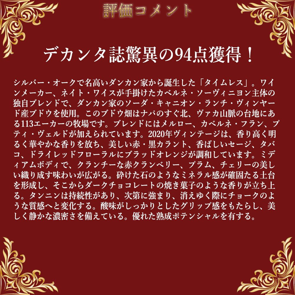この2020年でデカンタ誌驚異の94点でコメントは「シルバー・オークで名高いダンカン家から誕生した「タイムレス」。ワインメーカー、ネイト・ワイスが手掛けたカベルネ・ソーヴィニヨン主体の独自ブレンドで、ダンカン家のソーダ・キャニオン・ランチ・ヴィンヤード産ブドウを使用。このブドウ畑はナパのすぐ北、ヴァカ山脈の台地にある113エーカーの牧場です。ブレンドにはメルロー、カベルネ・フラン、プティ・ヴェルドが加えられています。2020年ヴィンテージは、香り高く明るく華やかな香りを放ち、美しい赤・黒カラント、香ばしいセージ、タバコ、ドライレッドフローラルにブラッドオレンジが調和しています。ミディアムボディで、クランチーな赤クランベリー、プラム、チェリーの美しい織り成す味わいが広がる。砕けた石のようなミネラル感が確固たる土台を形成し、そこからダークチョコレートの焼き菓子のような香りが立ち上る。タンニンは持続性があり、次第に強まり、消えゆく際にチョークのような質感へと変化する。酸味がしっかりとしたグリップ感をもたらし、美しく静かな濃密さを備えている。優れた熟成ポテンシャルを有する。」と激賞!