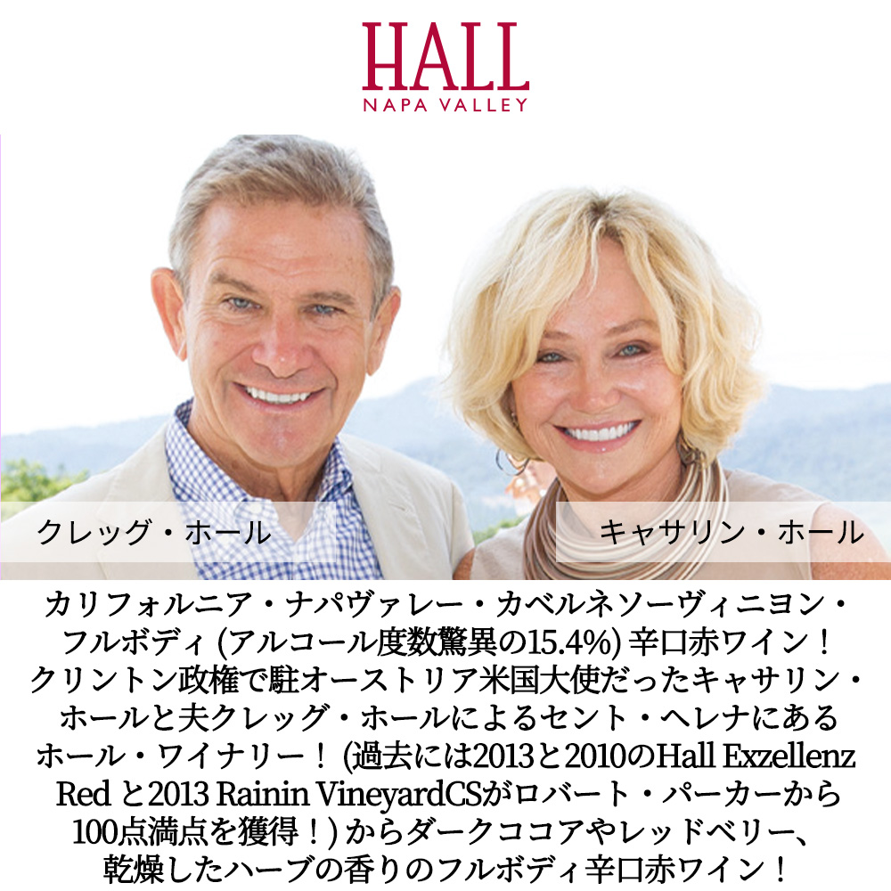 カリフォルニア・ナパヴァレー・カベルネソーヴィニヨン・フルボディ辛口赤ワイン愛好家大注目!クリントン政権で駐オーストリア米国大使の任務を終えたキャサリン・ホールと夫クレッグ・ホールによるセント・ヘレナにあるワイナリー! (過去には2013 と2010 のHall Exzellenz Red と2013 Rainin Vineyard CabernetSauvignonがロバート・パーカーから 100点満点を獲得しています。) のホール・ワイナリーからダークココアやレッドベリー、乾燥したハーブの香りが感じられます。味わいは、果実味が溢れ、ほのかにスパイスやレザーのニュアンスのフルボディ (アルコール度数驚異の15.4%) の辛口赤ワイン!