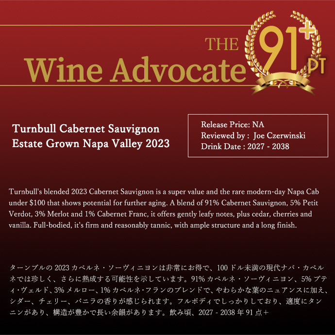 またこのワイン、ターンブル・カベルネ・ソーヴィニヨン・エステート・グロウン・ナパ・ヴァレー[2023]年でワインアドヴォケイト誌驚異の91点+の高評価獲得!絶賛コメントは『ターンブルの2023カベルネ・ソーヴィニヨンは非常にお得で、100ドル未満の現代ナパ・カベルネでは珍しく、さらに熟成する可能性を示しています。91%カベルネ・ソーヴィニヨン、5%プティ・ヴェルド、3%メルロー、1%カベルネ・フランのブレンドで、やわらかな葉のニュアンスに加え、シダー、チェリー、バニラの香りが感じられます。フルボディでしっかりしており、適度にタンニンがあり、構造が豊かで長い余韻があります。飲み頃、2027 - 2038年91点+』と絶賛!