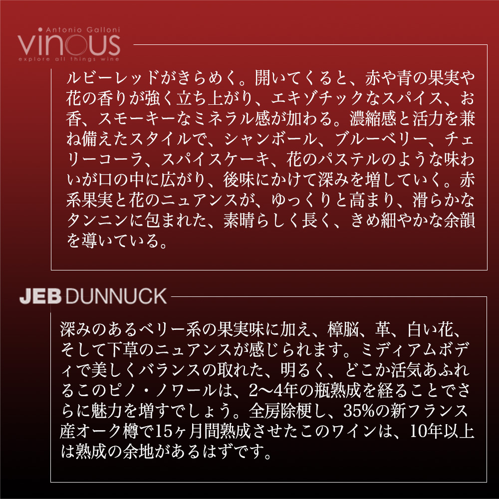 ジェブ・ダナック95点でコメントは「深みのあるベリー系の果実味に加え、樟脳、革、白い花、そして下草のニュアンスが感じられます。ミディアムボディで美しくバランスの取れた、明るく、どこか活気あふれるこのピノ・ノワールは、2~4年の瓶熟成を経ることでさらに魅力を増すでしょう。全房除梗し、35%の新フランス産オーク樽で15ヶ月間熟成させたこのワインは、10年以上は熟成の余地があるはずです。」!