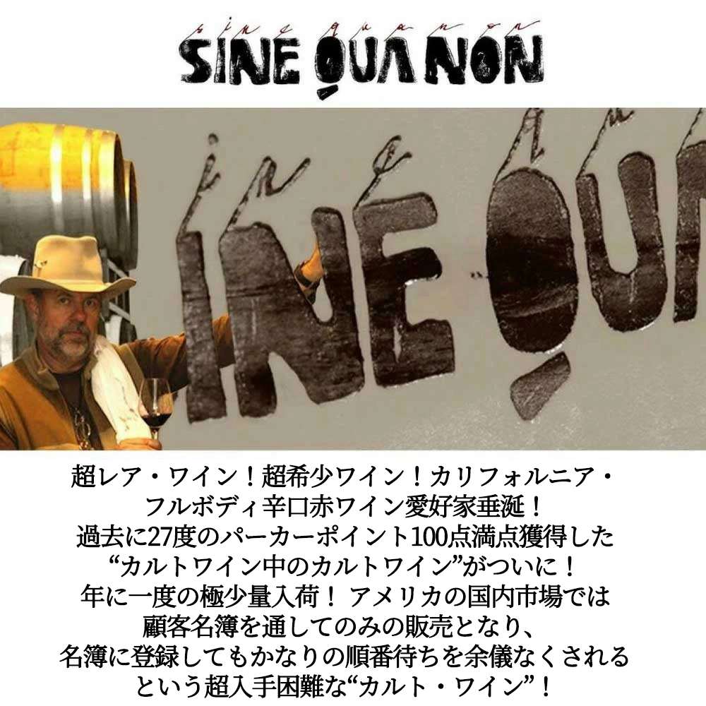 サンタ・バーバラ近郊のオーク・ヴューに位置する小さなワイナリーから、オーナー兼ワインメーカー・マンフレッド・クランクルの手による、カルトワインの中のカルトワイン!シネ・クア・ノン(ラテン語の「不可欠なもの」という意味)!のすべて3つの自社畑100%収穫のシリーズの究極超フルボディ辛口赤ワイン!
