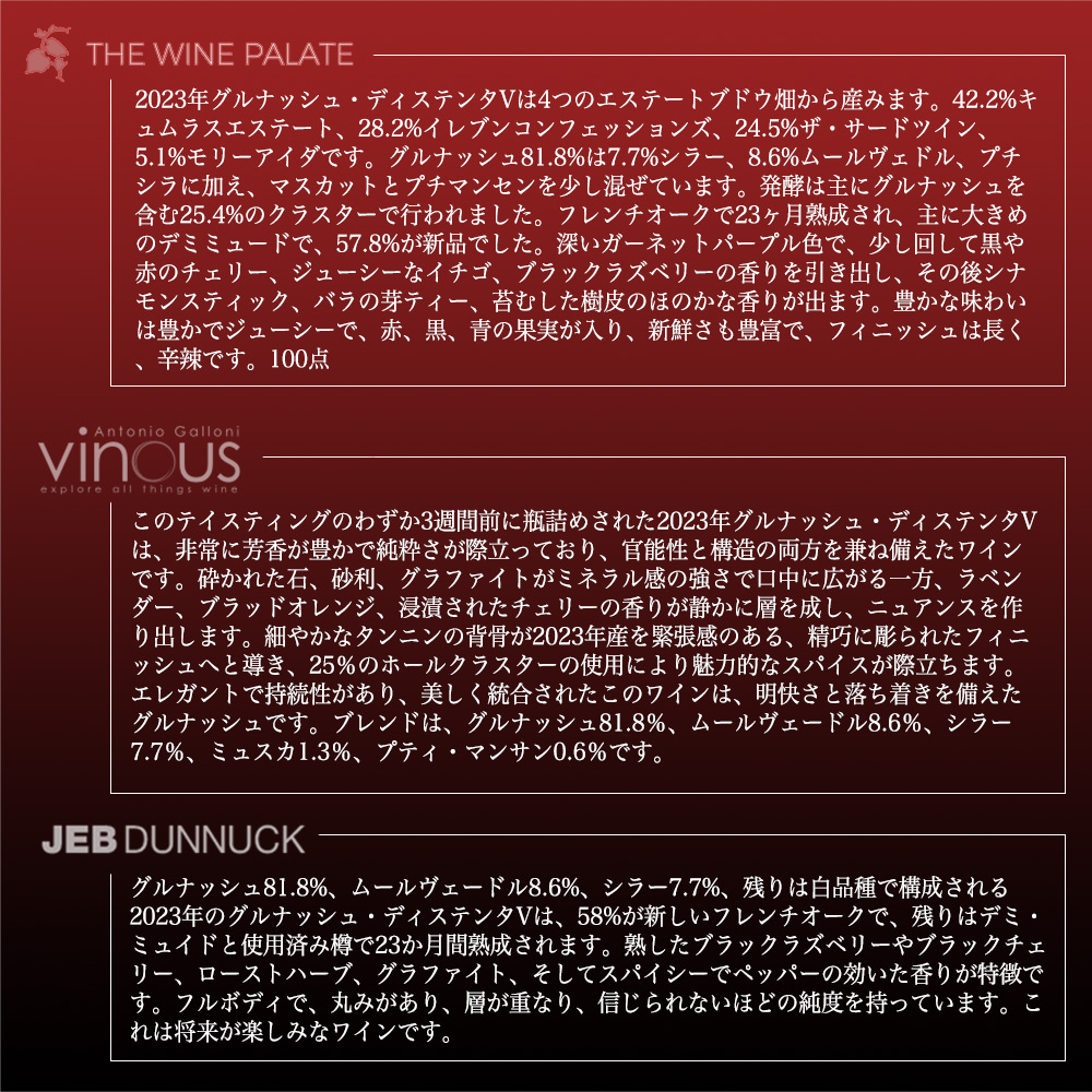 ヴィノス誌でも驚異の98点獲得!絶賛コメントは『このテイスティングのわずか3週間前に瓶詰めされた2023年グルナッシュ・ディステンタVは、非常に芳香が豊かで純粋さが際立っており、官能性と構造の両方を兼ね備えたワインです。砕かれた石、砂利、グラファイトがミネラル感の強さで口中に広がる一方、ラベンダー、ブラッドオレンジ、浸漬されたチェリーの香りが静かに層を成し、ニュアンスを作り出します。細やかなタンニンの背骨が2023年産を緊張感のある、精巧に彫られたフィニッシュへと導き、25%のホールクラスターの使用により魅力的なスパイスが際立ちます。エレガントで持続性があり、美しく統合されたこのワインは、明快さと落ち着きを備えたグルナッシュです。ブレンドは、グルナッシュ81.8%、ムールヴェードル8.6%、シラー7.7%、ミュスカ1.3%、プティ・マンサン0.6%です。98点』と大注目!