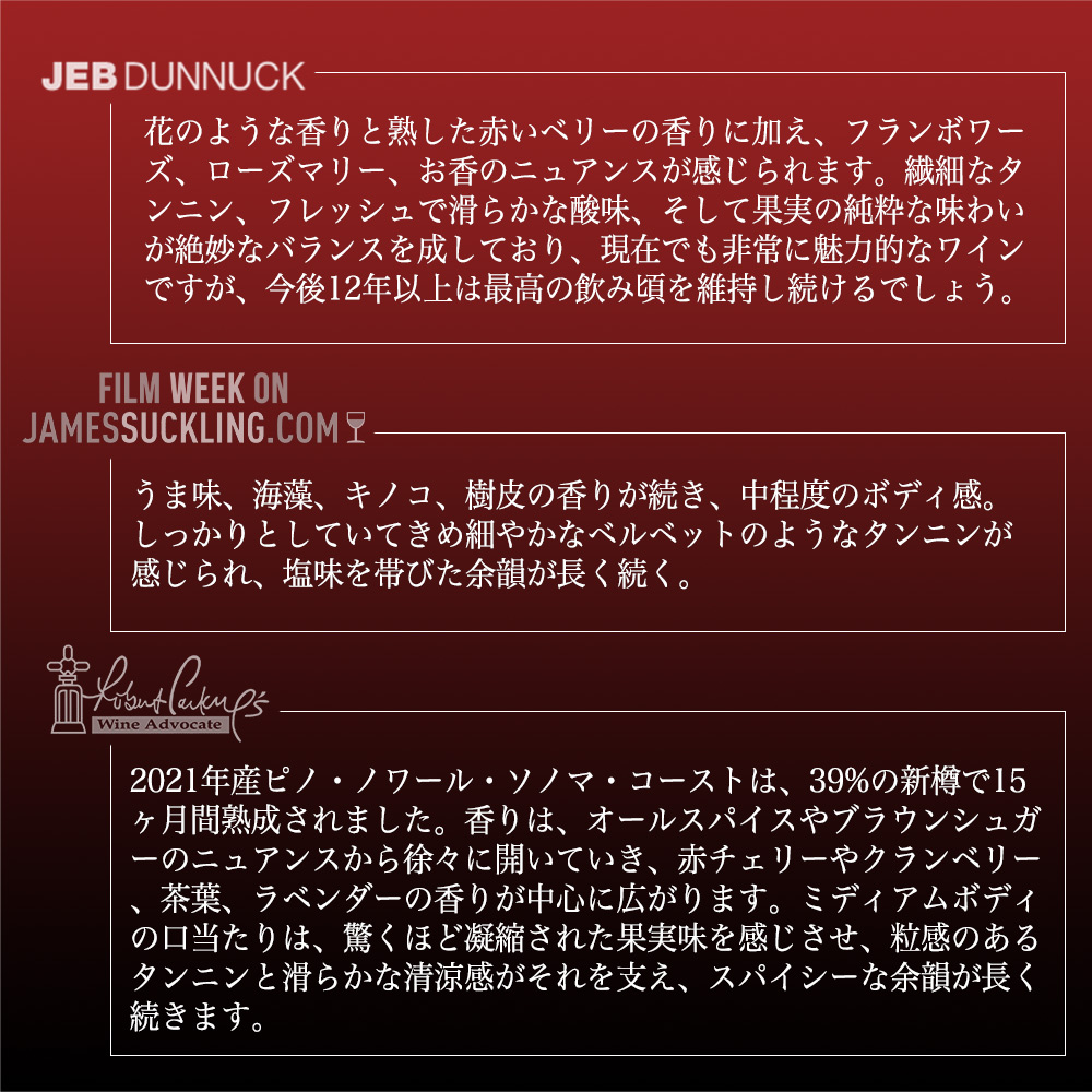 ワインアドヴォケイト93点でコメントは「2021年産ピノ・ノワール・ソノマ・コーストは、39%の新樽で15ヶ月間熟成されました。香りは、オールスパイスやブラウンシュガーのニュアンスから徐々に開いていき、赤チェリーやクランベリー、茶葉、ラベンダーの香りが中心に広がります。ミディアムボディの口当たりは、驚くほど凝縮された果実味を感じさせ、粒感のあるタンニンと滑らかな清涼感がそれを支え、スパイシーな余韻が長く続きます。」!