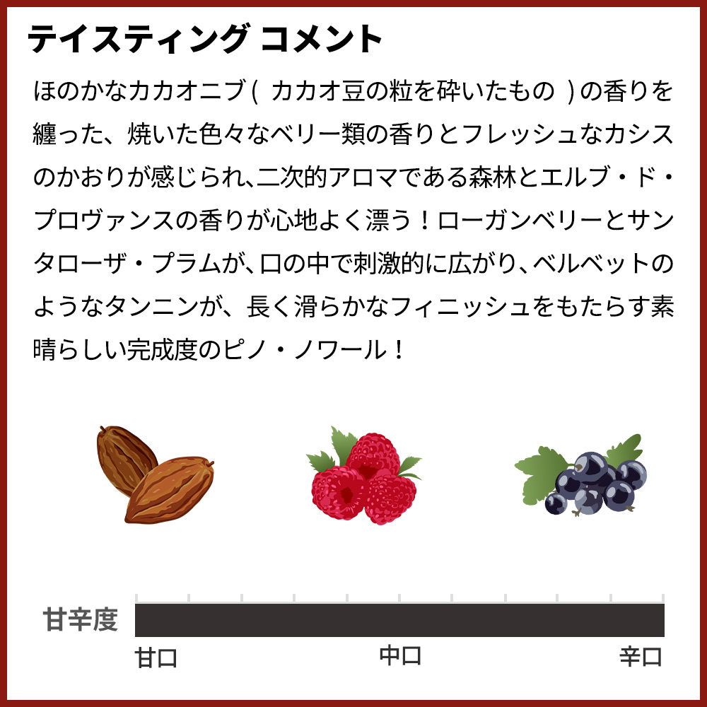 ほのかなカカオニブ (カカオ豆の粒を砕いたもの) の香りを纏った、焼いた色々なベリー類の香りとフレッシュなカシスのかおりが感じられ、二次的アロマである森林とエルブ・ド・プロヴァンスの香りが心地よく漂う!ローガンベリーとサンタローザ・プラムが、口の中で刺激的に広がり、ベルベットのようなタンニンが、長く滑らかなフィニッシュをもたらす素晴らしい完成度のピノ・ノワール!今や幻になってしまったコスタ・ブラウン・ソノマ・コースト・ピノが超限定で極少量入荷!