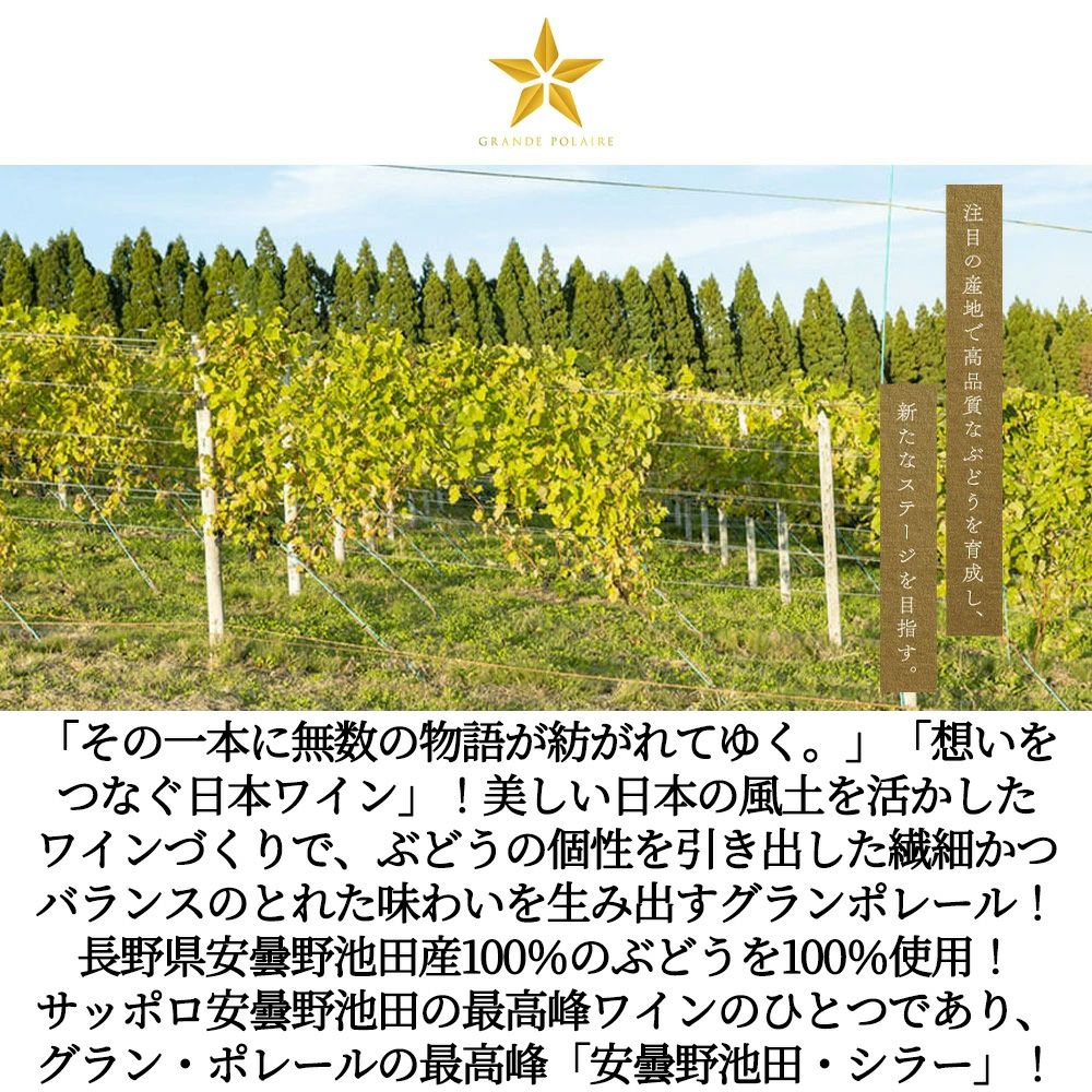 北海道、長野、山梨、岡山。美しい日本の風土を活かしたワインづくりを。つくり手の情熱がぶどうの個性を引き出した繊細かつバランスのとれた味わいを。美しさを求める日本人の感性を満たす、上質で豊かな時間を。フランス語で偉大さを表す「グラン」と北極星を意味する「ポレール」から名づけられた「グランポレール」。このワインが表現する世界は、日本の美しさ、そして日本ワインの星としての無二の存在感。日本が世界に誇る「美しい」プレミアムワイングランポレールが、日本ワインの新たな歴史を紡ぎます。
