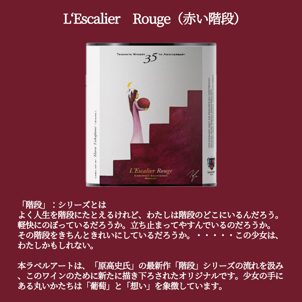 レスカリエ・ルージュ(赤い階段)・35周年記念ワイン[2022]年・超限定生産作品・高畠ワイナリー(日本ワイナリーアワード7年連続5つ星選出ワイナリー)元詰・(創業35周年記念ワイン)・(山形県高畠町産黒ブドウ100%使用=カベルネ・ソーヴィニヨン73.7%、メルロー26.3%)・オーク樽100%&24カ月熟成・アルコール度数14%・年産(全生産本数)わずか1000本のみ・日本ワイン・赤・フルボディ・辛口