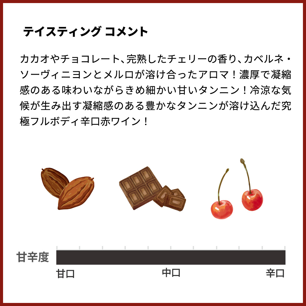 カカオやチョコレート、完熟したチェリーの香り、カベルネ・ソーヴィニヨンとメルロが溶け合ったアロマ!濃厚で凝縮感のある味わいながらきめ細かい甘いタンニン!冷涼な気候が生み出す凝縮感のある豊かなタンニンが溶け込んだ究極フルボディ辛口赤ワイン!自社畑100%のしかも選りすぐりのブドウのみで造られたグラン・ポレール最高品質フルボディ赤ワイン“メリタージュ (赤) ”が超限定で極少量入荷!