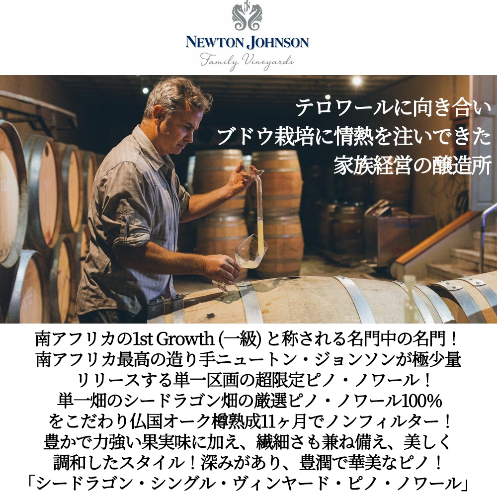 ニュートン・ジョンソン・ワインズ・シードラゴン・シングル・ヴィンヤード・ピノ・ノワール[2023]年・天然酵母発酵&フレンチオーク樽100%で11ヶ月・ノンフィルター・ニュートン・ジョンソン・ワインズ・W.O.アッパー・ヘンメル・エア・アーデ・ヴァレー・自然派(サステーナブル農法認証)・(赤ワイン・750ml・南アフリカ)