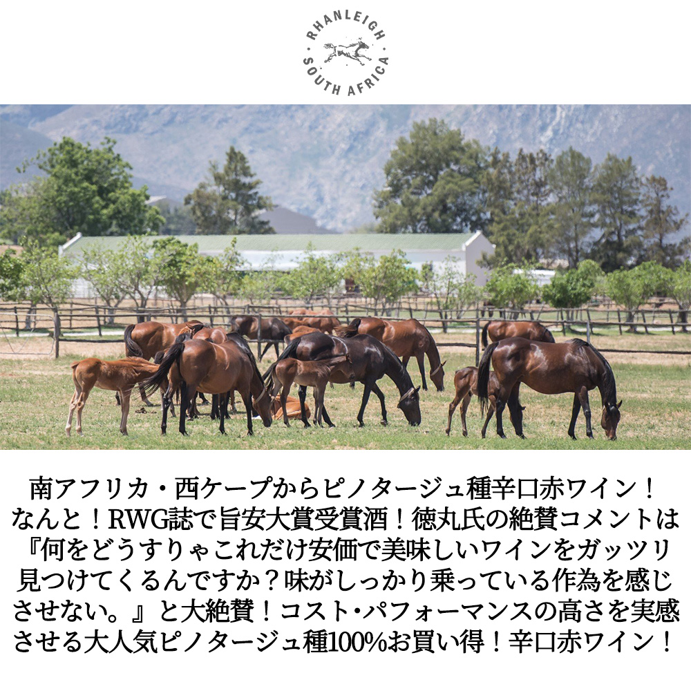 RHANLEIGHは1914 年に南アフリカの名高い“South African Durban July Handicap”レースを制した同名の美しいサラブレッド競走馬にちなんで名付けられました。ワイナリーは西ケープ州のロバートソンとアシュトンの間にあります。