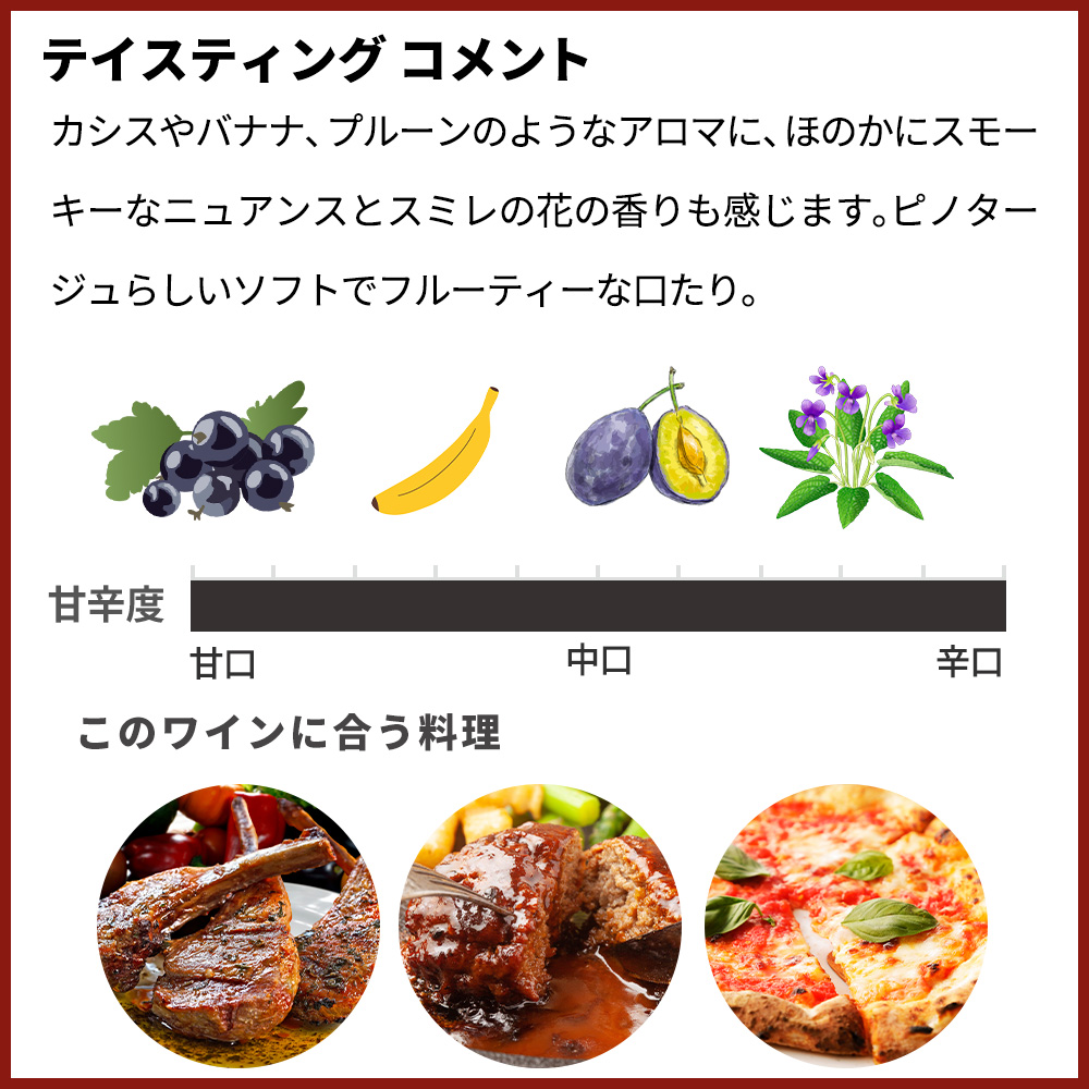 カシスやバナナ、プルーンのようなアロマに、ほのかにスモーキーなニュアンスとスミレの花の香りも感じます。ピノタージュらしいソフトでフルーティーな口たり。ピュアな酸味できれいに消えていきます。RWG誌・旨安大賞&ジルベール・ガイヤール・ゴールドメダル・金賞受賞酒のピノタージュ種100%!大人気赤ワインが限定入荷!