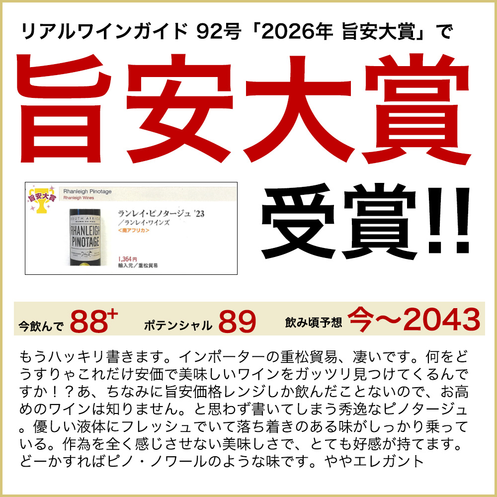ランレイ・ピノタージュ[2023]年・ランレイ・ワイナリー(南アフリカ・WOウェスタン・ケープ)・ピノタージュ種100%・RWG誌・旨安大賞&ジルベール・ガイヤール・ゴールドメダル・金賞受賞酒・アルコール度数14%・赤