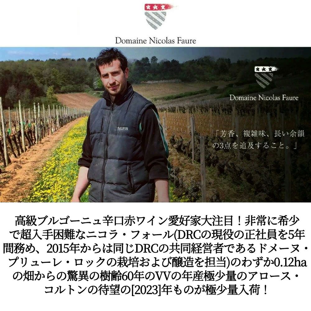 他の画像を見る 【お1人様1本限り】アロース コルトン 2023 蔵出し限定作品 ドメーヌ ニコラ フォール元詰 全生産本数(全世界に)わずか約400本あまり 正規品Aloxe Corton 2023 Domaine Nicilas Faure AOC 赤ワイン フランス フルボディ 辛口 当店特別価格 ¥ 45,771 税込 在庫切れ 詳細を見る お気に入りに登録する