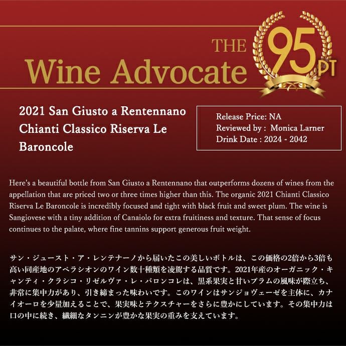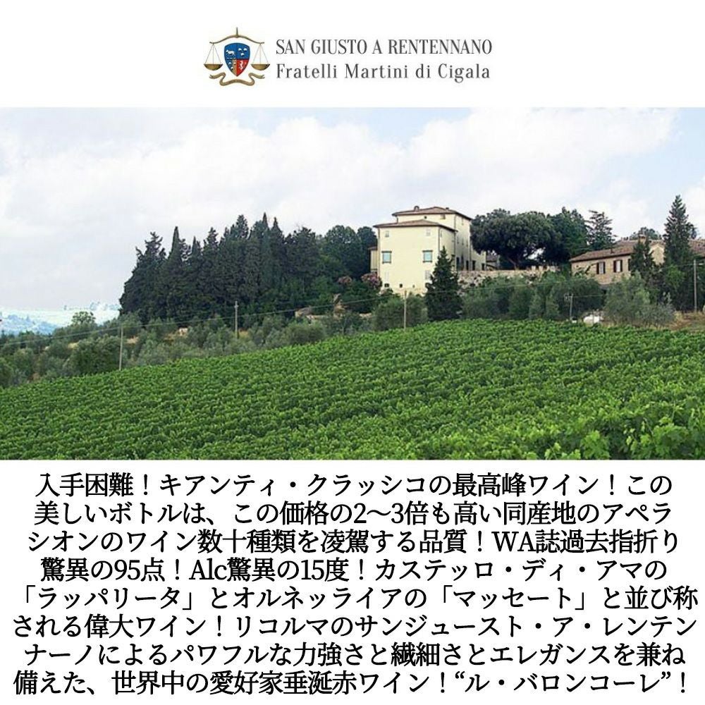 他の画像を見る キアンティ クラシコ リゼルヴァ ル バロンコーレ 2021 蔵出し品 サンジュースト ア レンテンナーノ元詰(マルティーニ ディ シガラ) 自然派Chianti Classico Riserva Le Baroncole 2021 赤ワイン イタリア フルボディ 辛口 自然派 当店特別価格 ¥ 6,249 税込 カートに入れる お気に入りに登録する
