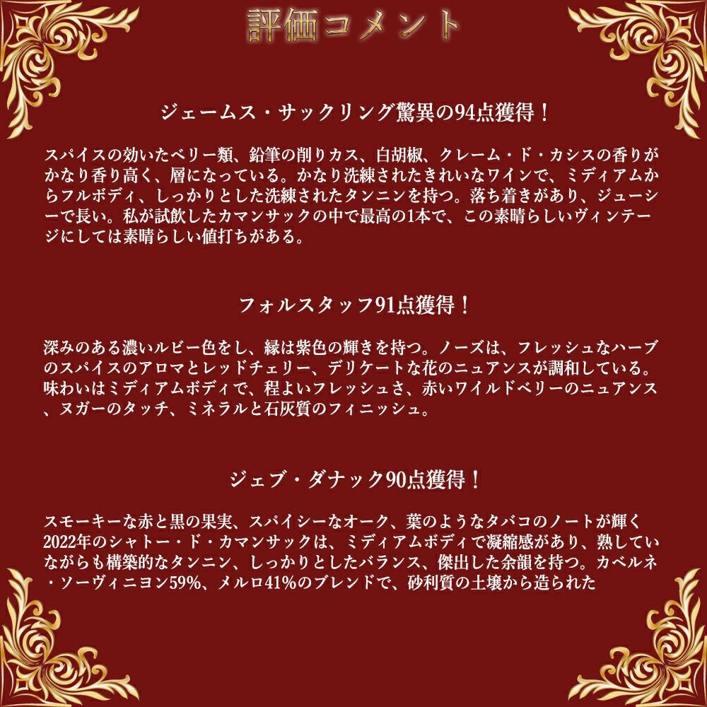 他の画像を見る シャトー カマンサック 2022 メドック グラン クリュ クラッセ 格付第五級 AOCオー メドック JS驚異の94点&JD90点&ヴィノス93点Chateau de CAMENSAC 2022 Grand Cru Classe du 赤ワイン フランス フルボディ 辛口 当店特別価格 ¥ 5,517 税込 カートに入れる お気に入りに登録する