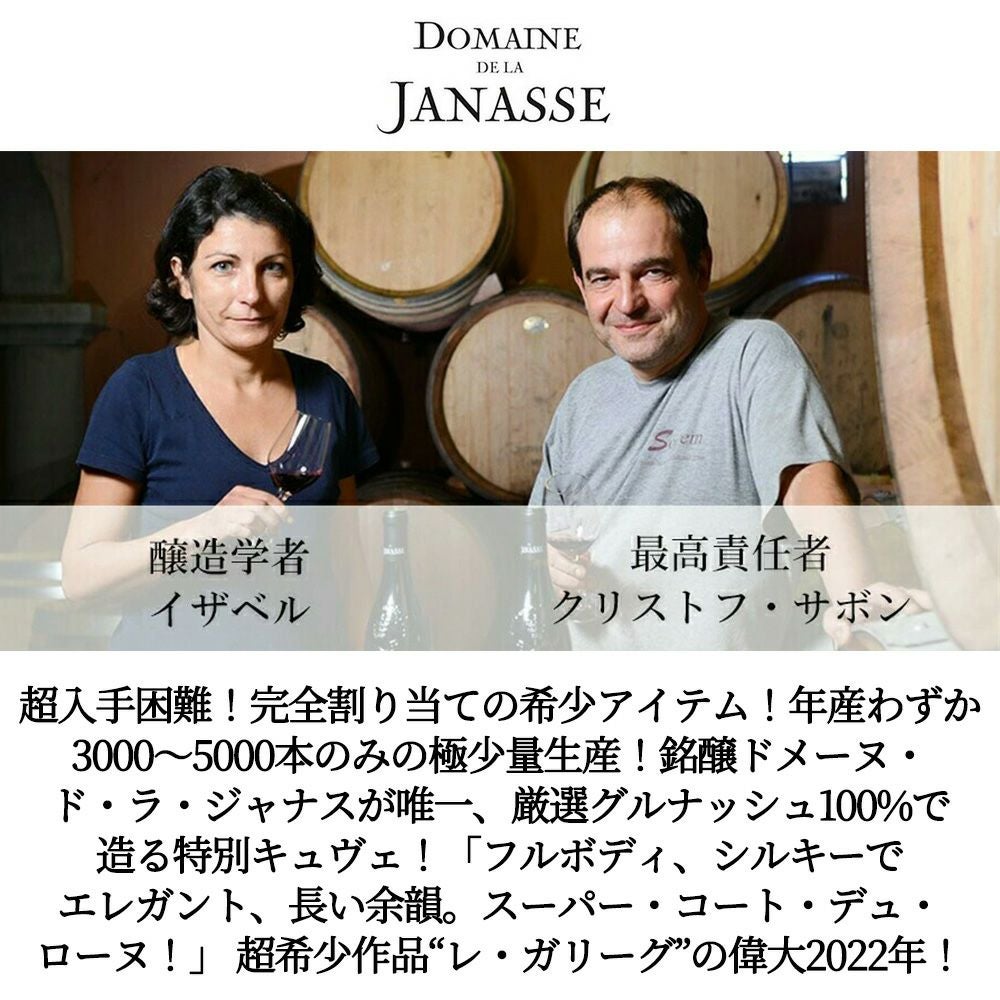 他の画像を見る コート デュ ローヌ レ ガリーグ 2022 ドメーヌ ド ラ ジャナス元詰 重厚ボトル AOCコート デュ ローヌCotes du Rhone Les Garrigues 2022 Domaine de la JANASSE 赤ワイン フランス フルボディ 辛口 当店特別価格 ¥ 7,106 税込 カートに入れる お気に入りに登録する