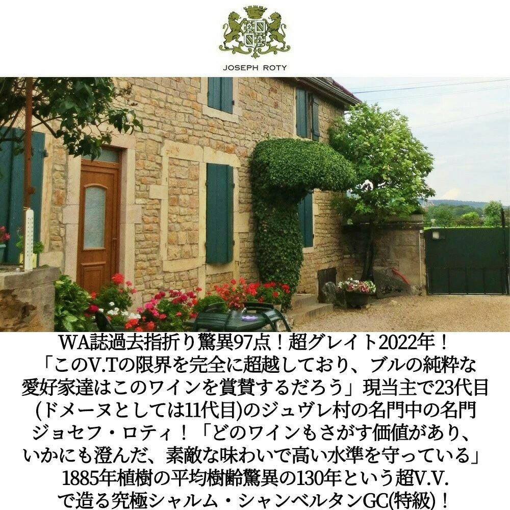 他の画像を見る シャルム シャンベルタン グラン クリュ 特級 トレ ヴィエイユ ヴィーニュ 2022 蔵出し秘蔵品 ドメーヌ ジョセフ ロティ元詰 正規品Charmes Chambertin Grand Cru de Tres Vieilles Vignes 赤ワイン フランス フルボディ 辛口 当店特別価格 ¥ 79,420 税込 カートに入れる お気に入りに登録する