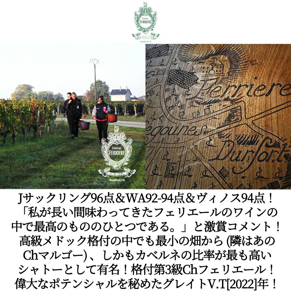 他の画像を見る シャトー フェリエール 2022 手摘み100% ジェームス サックリング驚異の96点&ワインアドヴォケイト92-94点&ヴィノス誌94点Chateau FERRIERE 2022 AOC Margaux 3e Grand Cru 赤ワイン フランス フルボディ 辛口 当店特別価格 ¥ 8,339 税込 カートに入れる お気に入りに登録する