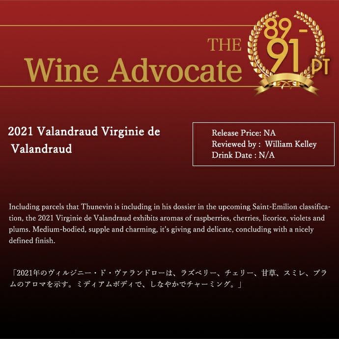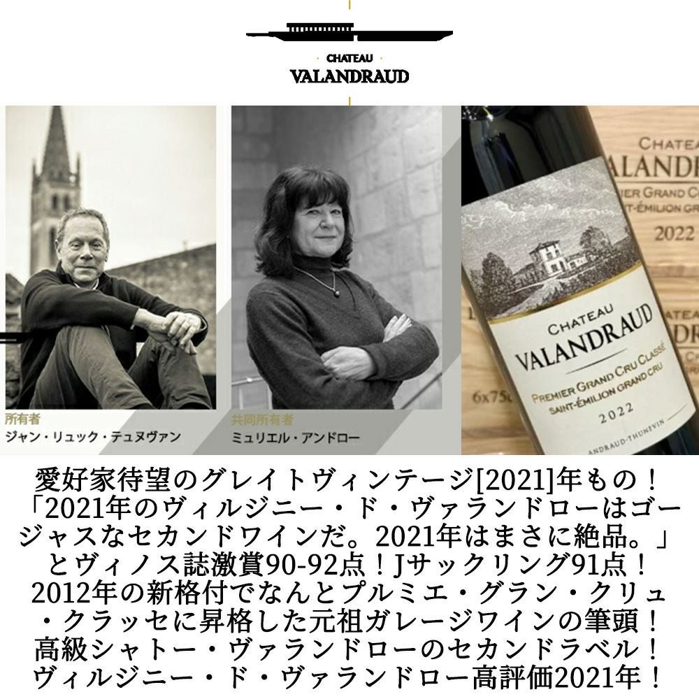 他の画像を見る ヴィルジニー ド ヴァランドロー 2021 AOCサンテミリオン グラン クリュ 特級 シャトー元詰(ジャン リュック テュヌヴァン)Virginie de Valandraud 2021 AOC Saint Emilion Grand Cru 赤ワイン フランス フルボディ 辛口 当店特別価格 ¥ 6,353 税込 カートに入れる お気に入りに登録する