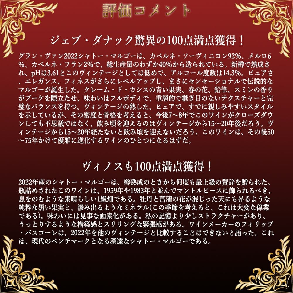 他の画像を見る シャトー マルゴー 2022 プルミエ グラン クリュ クラッセ (メドック格付第一級) ジェブ ダナック100点満点&ヴィノス100点満点Chateau Margaux 2022 1er Grand Cru Classe du Medoc 赤ワイン フランス フルボディ 辛口 当店特別価格 ¥ 104,291 税込 カートに入れる お気に入りに登録する