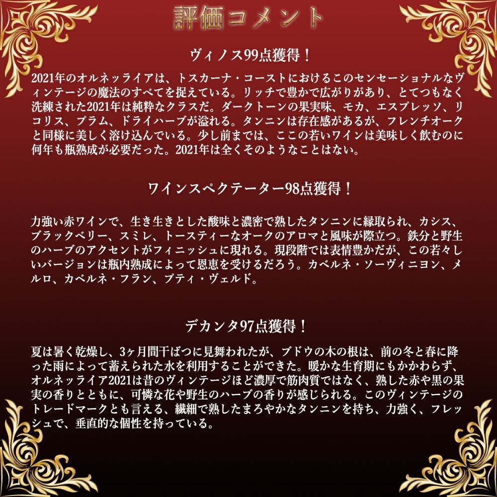 他の画像を見る オルネッライア 2021 蔵出し限定品 テヌータ デッロルネッライア WA96点&The Wine Independent100点満点 正規品 赤ORNELLAIA 2021 Tenuta dell' Ornellaia DOC Bolgheri 赤ワイン イタリア フルボディ 辛口 当店特別価格 ¥ 35,843 税込 カートに入れる お気に入りに登録する