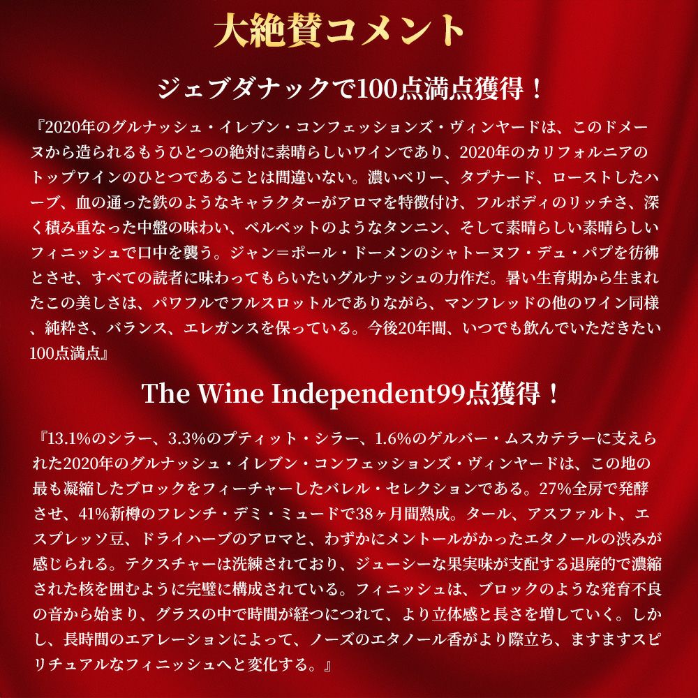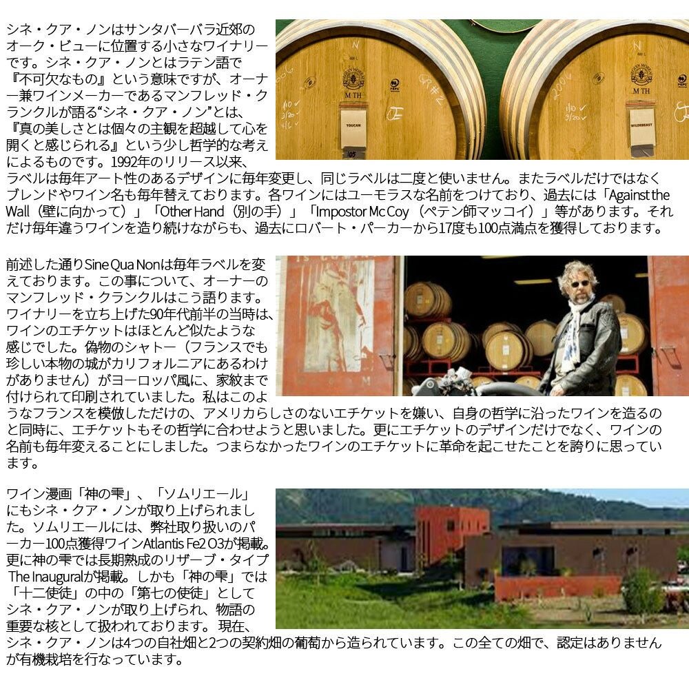 他の画像を見る シネ クア ノン イレヴン コンフェッションズ グルナッシュ 2020 蔵出し作品 マンフレッド クランクル元詰Sine Qua Non Grenache Eleven Confessions Vineyard Grenache 2020 赤ワイン アメリカ フルボディ 辛口 当店特別価格 ¥ 124,334 税込 カートに入れる お気に入りに登録する