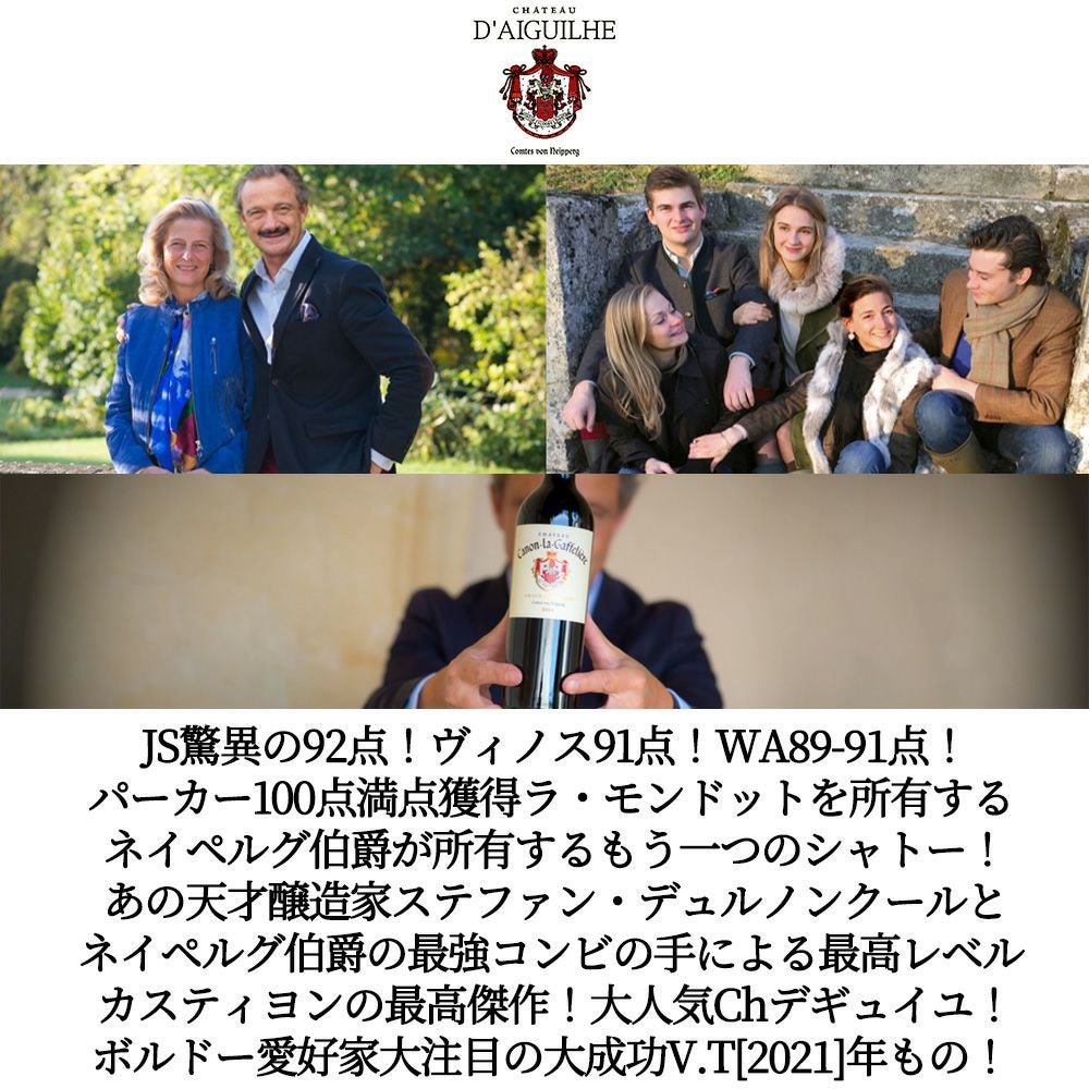 他の画像を見る シャトー デギュイユ(デギーユ) 2021 ネイペルグ伯爵&天才醸造家ステファン デュルノンクール ジェームス サックリング92点&ヴィノス誌91点Chateau D'AIGUILHE 2021 赤ワイン フランス フルボディ 辛口 当店特別価格 ¥ 4,159 税込 カートに入れる お気に入りに登録する