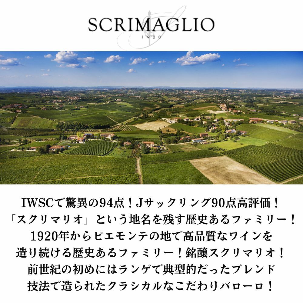 他の画像を見る バローロ 2019 スクリマリオ DOCGバローロ 5000Lのフレンチオーク樽にて24ヶ月以上 アルコール度数14%Barolo 2019 Scrimaglio DOCG Barolo 赤ワイン イタリア フルボディ 辛口 当店特別価格 ¥ 4,587 税込 カートに入れる お気に入りに登録する