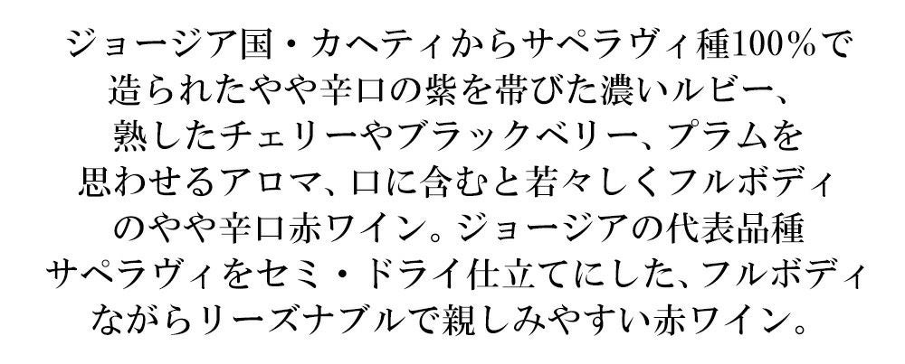 他の画像を見る ルトヴェリシ ピロスマニ サペラヴィ 2024 ルトヴェリシ社 サペラヴィ種100% ジョージア カヘティ州 フルボディ 赤 やや辛口Pirosmani Saperavi 2024 RTVELISI GEORGIA Kakheti 赤ワイン フルボディ 辛口 当店特別価格 ¥ 1,337 税込 カートに入れる お気に入りに登録する