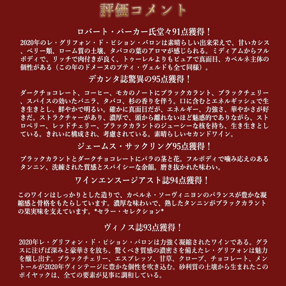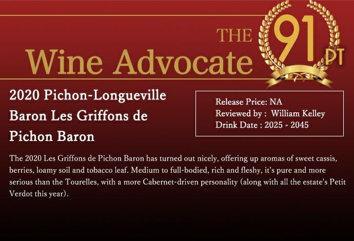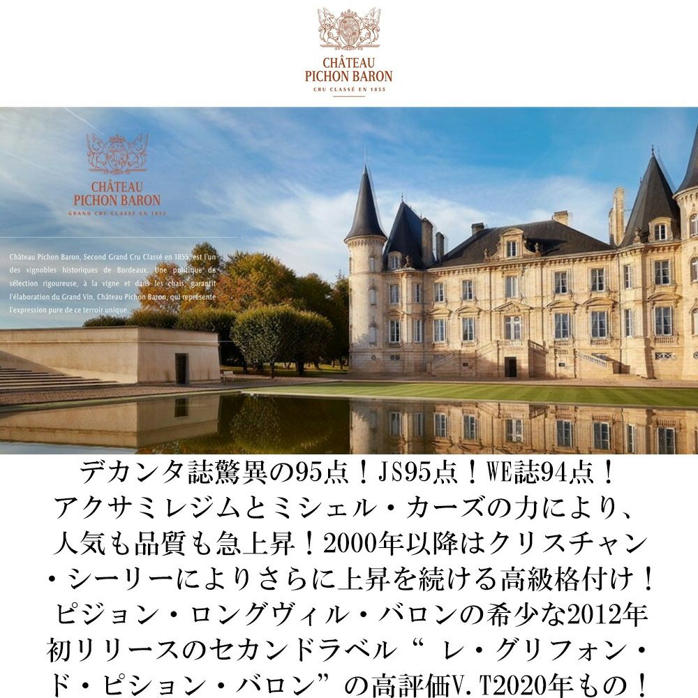 他の画像を見る レ グリフォン ド ピション バロン 2020 シャトー ピション ロングヴィル バロン元詰Les Griffons de Pichon Baron [2020] (Chateau Pichon Longueville Baron) 赤ワイン フランス フルボディ 辛口 当店特別価格 ¥ 7,680 税込 カートに入れる お気に入りに登録する