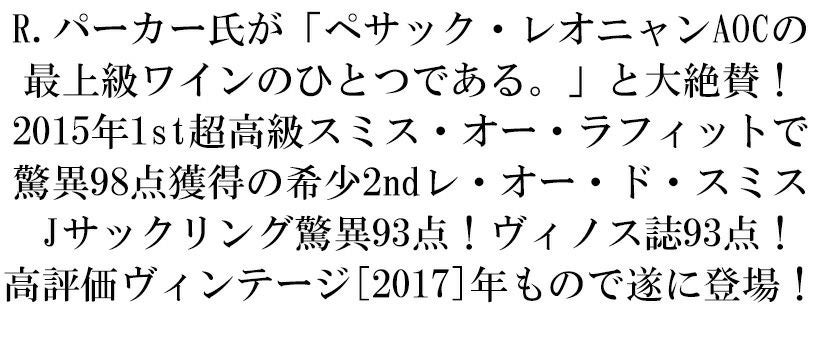 他の画像を見る レ オー ド スミス 2017 オーク樽14ヶ月熟成 シャトー スミス オー ラフィットの2ndラベル AOCペサック 赤ワイン フランスワイン 辛口Les Hauts de SMITH 2017 AOC Pessac Leognan 赤ワイン フランス フルボディ 辛口 当店特別価格 ¥ 5,673 税込 カートに入れる お気に入りに登録する