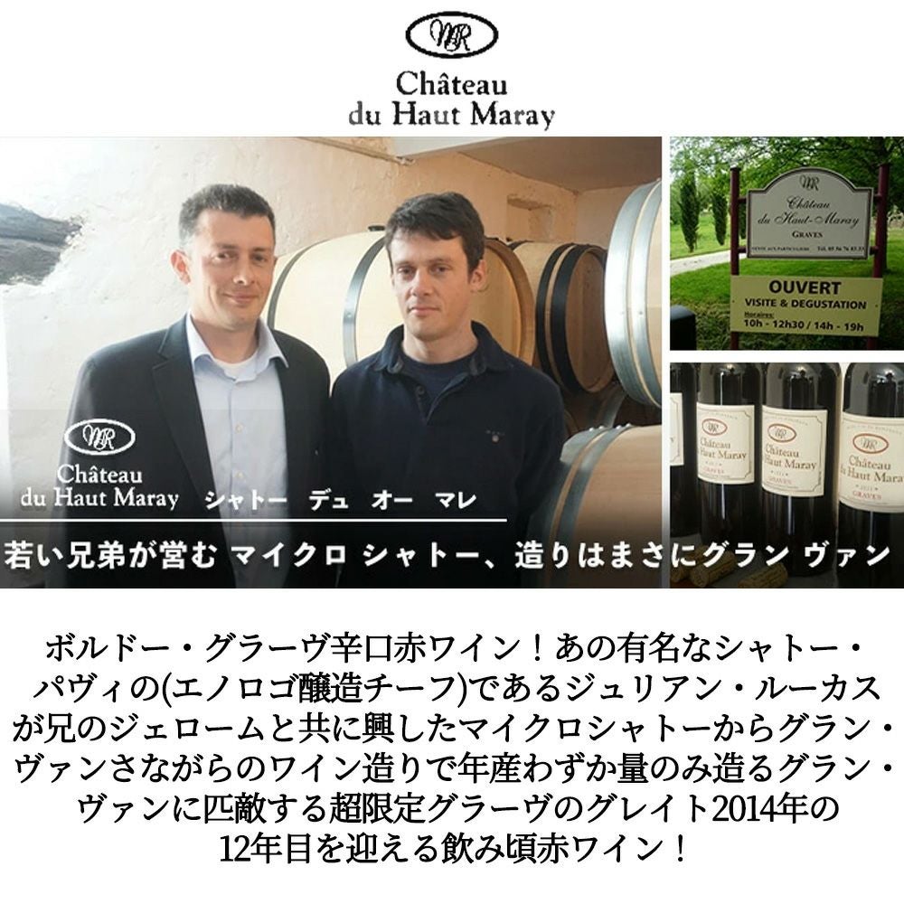 他の画像を見る シャトー デュ オー マレ ルージュ 2014 蔵出し品 AOCグラーヴ 樽熟成 驚異の22ヶ月 アルコール驚異の14% M ルーカス 12年熟成品Chateau du Haut Maray Rouge 2014 AOC Graves 14% 赤ワイン フランス フルボディ 辛口 当店特別価格 ¥ 3,762 税込 カートに入れる お気に入りに登録する