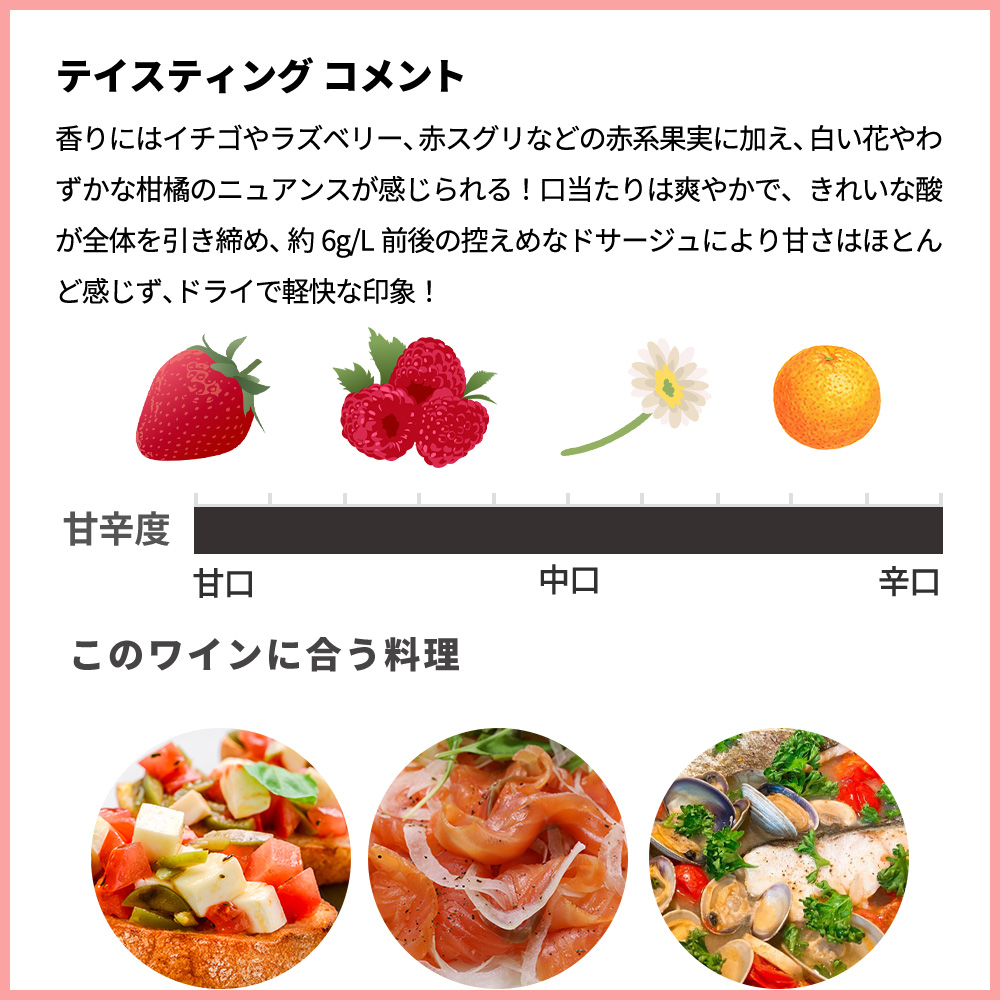 外観は淡いサーモンピンクで、香りにはイチゴやラズベリー、赤スグリなどの赤系果実に加え、白い花やわずかな柑橘のニュアンスが感じられる!口当たりは爽やかで、きれいな酸が全体を引き締め、約6g/L前後の控えめなドサージュにより甘さはほとんど感じず、ドライで軽快な印象!細かな泡とフレッシュな果実味が調和し、後味にはほのかなミネラル感と心地よい余韻が残る秀逸ロゼスパークリングワイン!食前酒としてはもちろん、軽い前菜や魚介料理とも相性が良い銘醸ルイ・ピカメロ社のクレマン・ド・ブルゴーニュ・ロゼ・ブリュットが正規代理店輸入品で限定で少量入荷!