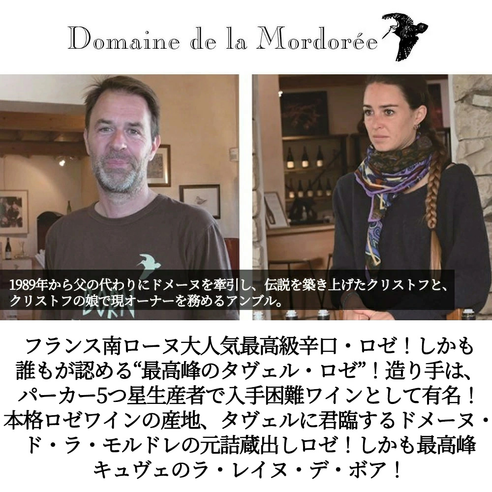 造り手は、パーカー5つ星生産者で入手困難ワインとして有名!本格ロゼワインの産地、タヴェルに君臨する有名造り手、ドメーヌ・ド・ラ・モルドレの元詰蔵出しロゼ!あのロバート・パーカー氏も「世界で最も偉大なワインエステートのひとつ、その持ち主であるクリストフェル・デロルムは約15年にわたりこのドメーヌの品質をトップに保ち続けている。ドメーヌ・ド・ラ・モルドレの白・赤・ロゼは、南ローヌヴァレーのお手本となるものである。」と絶賛!クリストフ・デロルム氏は2016年に急逝!現在はあの伝説の父親フランシス・デロルム氏とクリストフ氏の娘アンブル氏がワイン造りを引き継ぎ、生産!