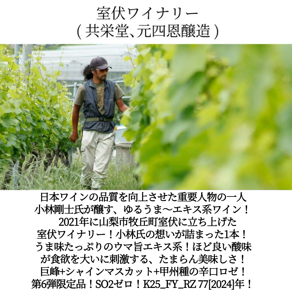 室伏ワイナリーについて「室伏 (むろふし) ワイナリーは日本ワインの品質を向上させた重要人物の一人である小林剛士さん (通称つよぽん) が2021年に山梨市牧丘町室伏に立ち上げた、最大生産規模15万本のキャパシティを持つ中規模ワイナリー。小林さんは四恩醸造時代の2007年頃に衝撃のゆるうま~ワインを恐らく日本で初めて造り、日本ワインの新たな魅力を大いに広めた方。そういった点で間違いなく先駆者のひとりである。そんなカリスマ的人気を博してきた小林さんが、日本ワイン界を活性化し、さらに発展させるために新たな挑戦の場として選んだのが、高品質なワインを造る中規模ワイナリーを興すこと。 小林さんが目指すのは究極のテーブルワイン。若い人やワイン入門編として飲んでもらうことが大切なので、飲み心地が柔らかくスッ~と飲めてしまう、いわゆる飲みやすいもの。そして、これはワインを飲み慣れた愛好家が求めるものでもある。価格の安さに徹底的にこだわるのも若い人たちに気軽に飲んで欲しいからで、このご時世でも高いもので税込み2,420円というお値段。そしてこの信念はワイン造りをスタートさせた時から全く変わっていない。室伏ワイナリーは自社畑のブドウと栽培農家からの買いブドウを全て混ぜて使う。それはどちらのブドウも同等に高品質なので分ける必要がないから。どの品種をどのようにブレンドして目指す味わいを引き出すかは小林さんの腕の見せどころであり、これぞセンスが光るところ。」!