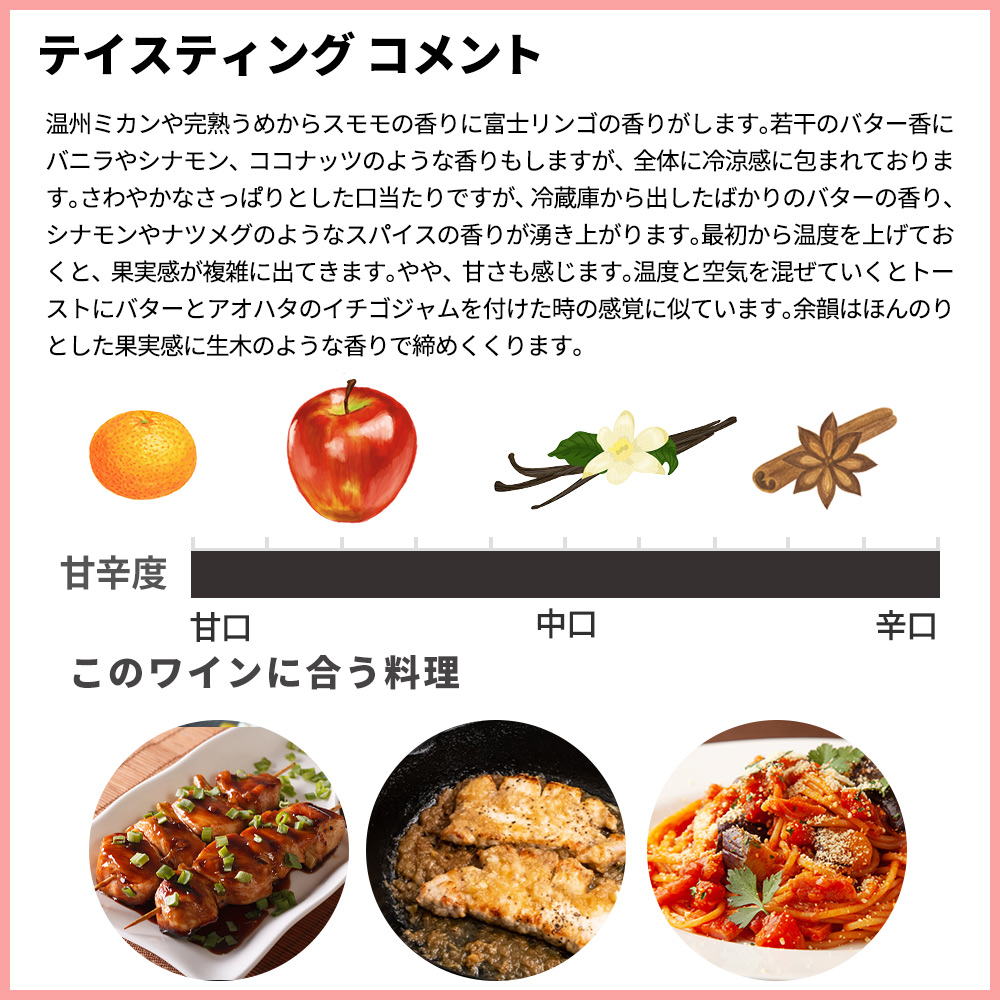 このワインについて生産者小林剛史さんコメントは『透明度はあるがやや濁りのある紅梅色。温州ミカンや完熟うめからスモモの香りに富士リンゴの香りがします。若干のバター香にバニラやシナモン、ココナッツのような香りもしますが、全体に冷涼感に包まれております。さわやかなさっぱりとした口当たりですが、冷蔵庫から出したばかりのバターの香り、シナモンやナツメグのようなスパイスの香りが湧き上がります。最初から温度を上げておくと、果実感が複雑に出てきます。やや、甘さも感じます。温度と空気を混ぜていくとトーストにバターとアオハタのイチゴジャムを付けた時の感覚に似ています。余韻はほんのりとした果実感に生木のような香りで締めくくります。 ふくよかなグラスのほうがよさそうです。樽由来の香りと果実の香りが時間差で出てきます。若干温度高めの10度以上のほうが香りと口当たりの柔らかさが相まって、清涼感の中の違った感覚に楽しさが見いだせるのではないかと思います。 根菜ゴロゴロとトマトの煮込み、ミネストローネはどうでしょうか?焼き鳥(シンプルなもも)をかじりながらでもいけそうです。ベーコンや豚ロースのステーキ。BBQのお供に良さそうです。 2024年の巨峰とシャインマスカットそして甲州種です。約1年間中樽で熟成しておりました。』と大注目!